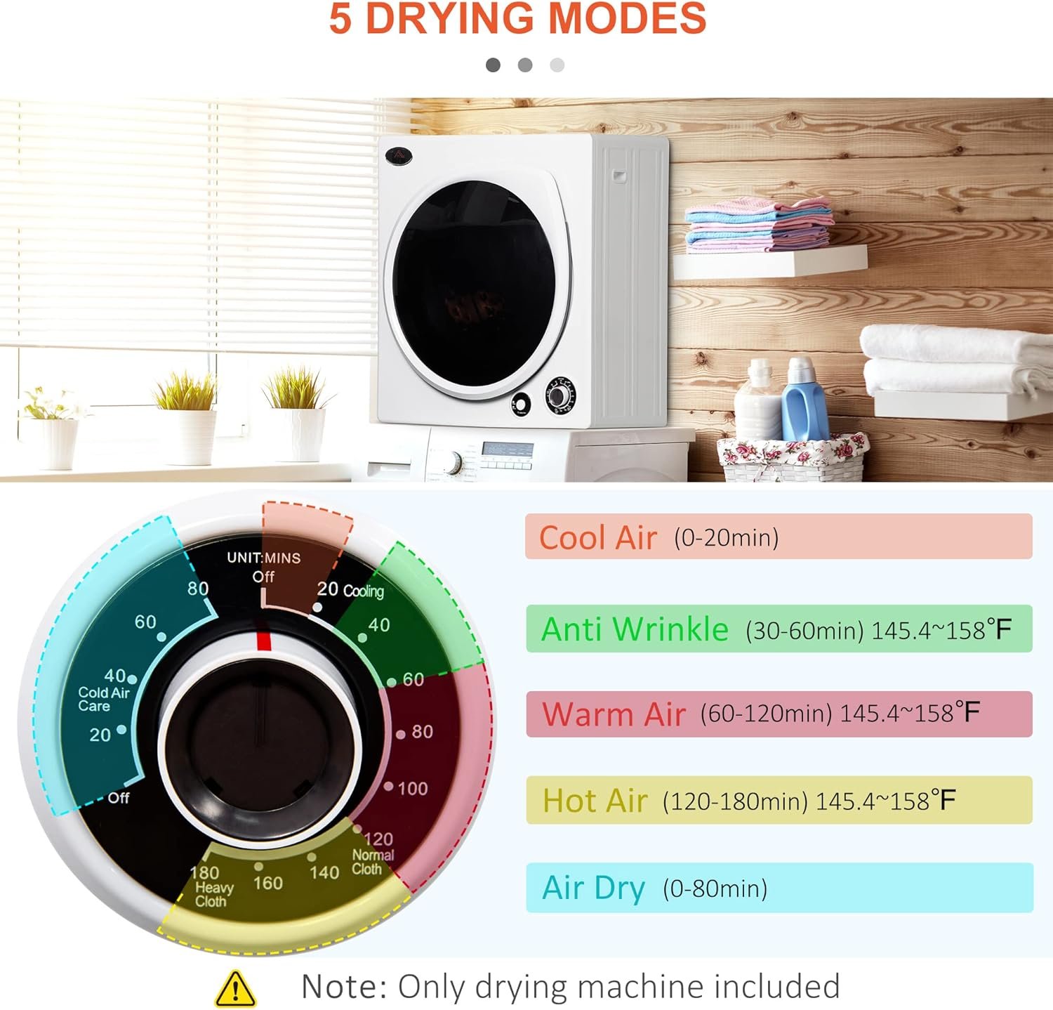 Multiple Setting: With this compact laundry dryer, you can choose from five different drying modes, including cool air, anti-wrinkle, warm air, hot air, and air dry and 2 heating choice, depending on the materials and weight of your clothing.