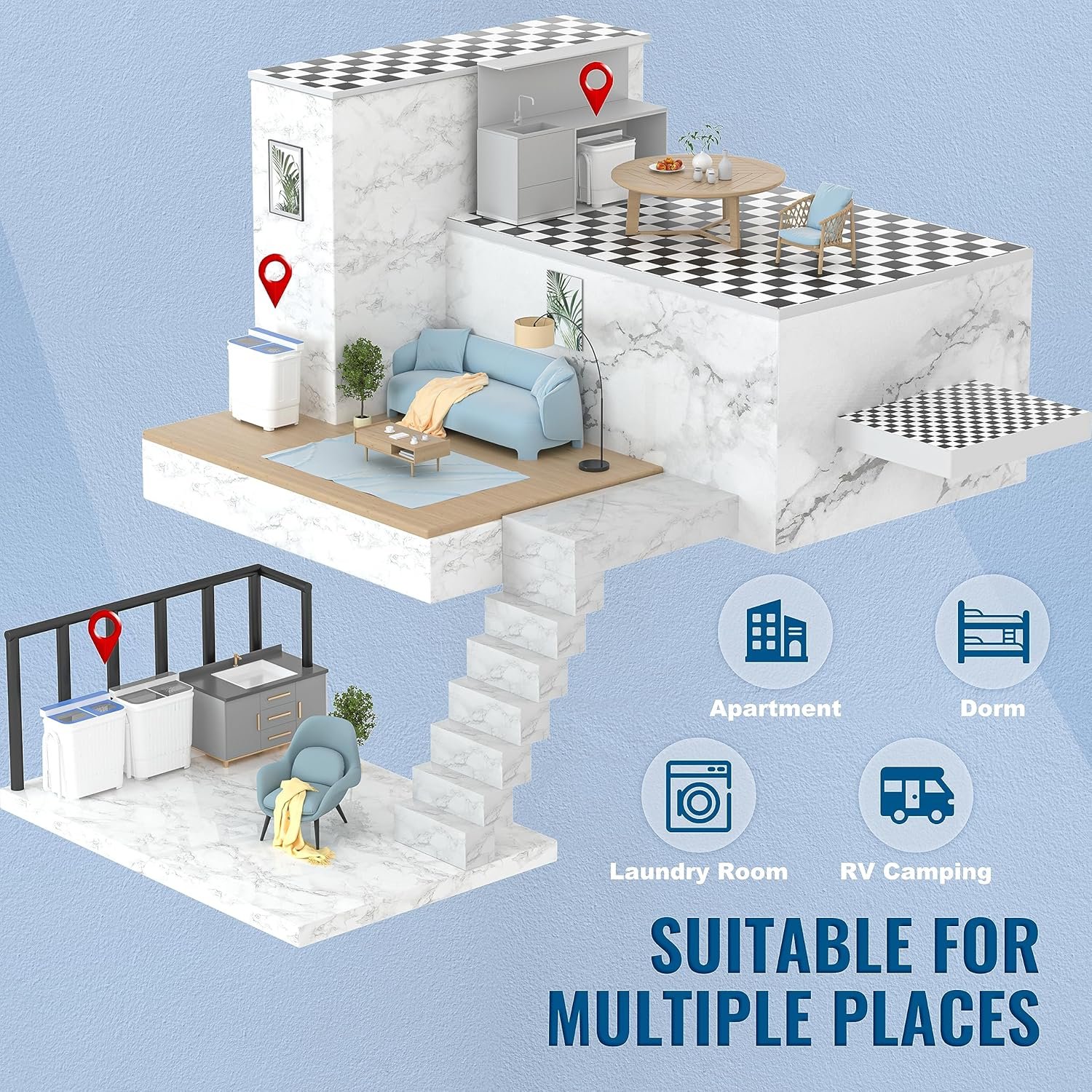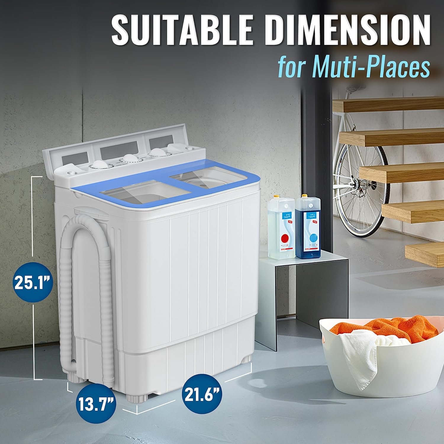 【Large Capacity and Powerful】: Mini lavadora, but large capacity. 11 lbs for washer and 6.6 lbs for spin tub, what’s more, the spin tub is made of stainless steel, for long term use. Also, our apartment washer with powerful motor, 280 W washing power and 160 spin power, built-in gravity drain, full free your hands
