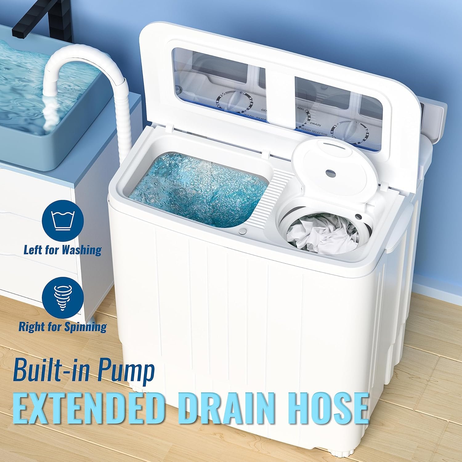 【Time Control】: Semi-automatic washing machine can washer and dry at the same time. Remember to remove filter collects unnecessary debris after washing. It is also convenient for your family use, just put the clothes in – fill with water -choose modes- set time – – Go and sip your coffee