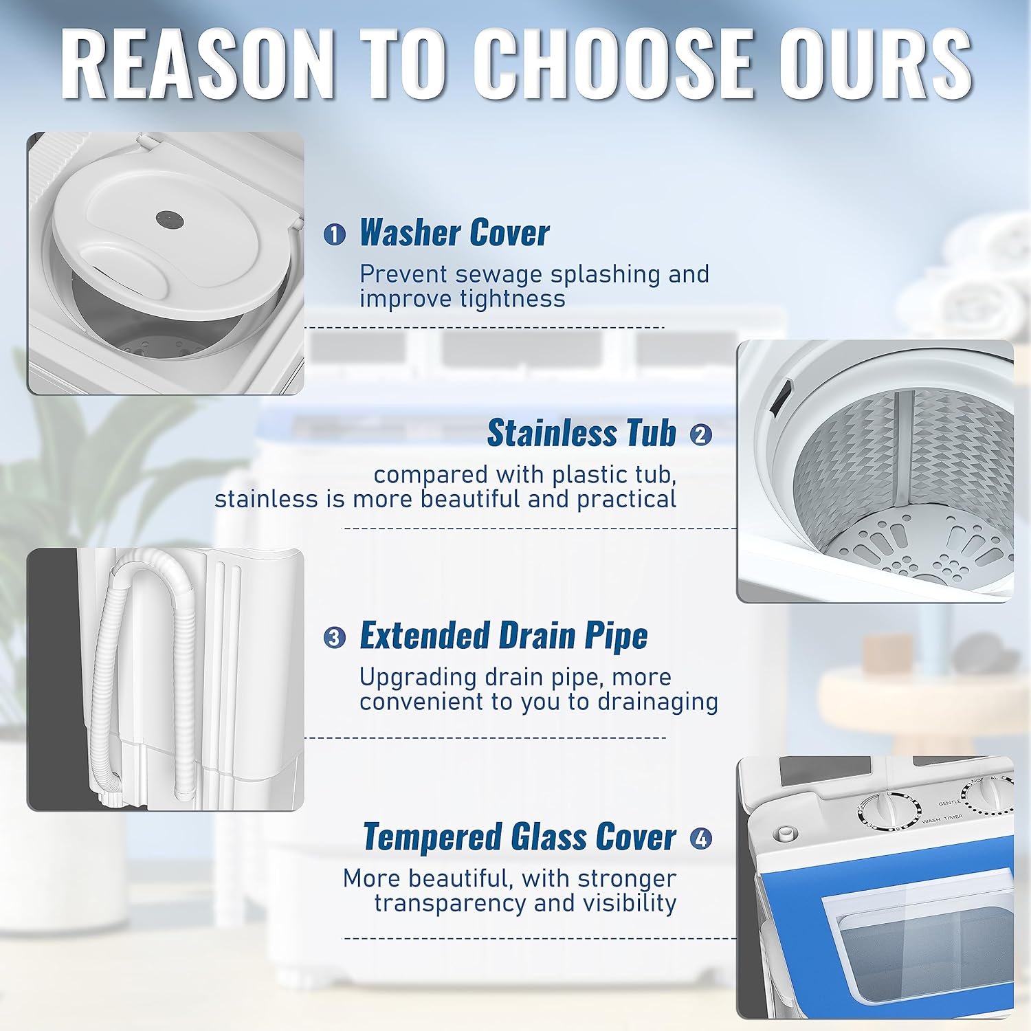Compact laundry washer with glass cover, more durable, easy to clean. It’s not easy to crack when you put the basket on the cover to take the clothes