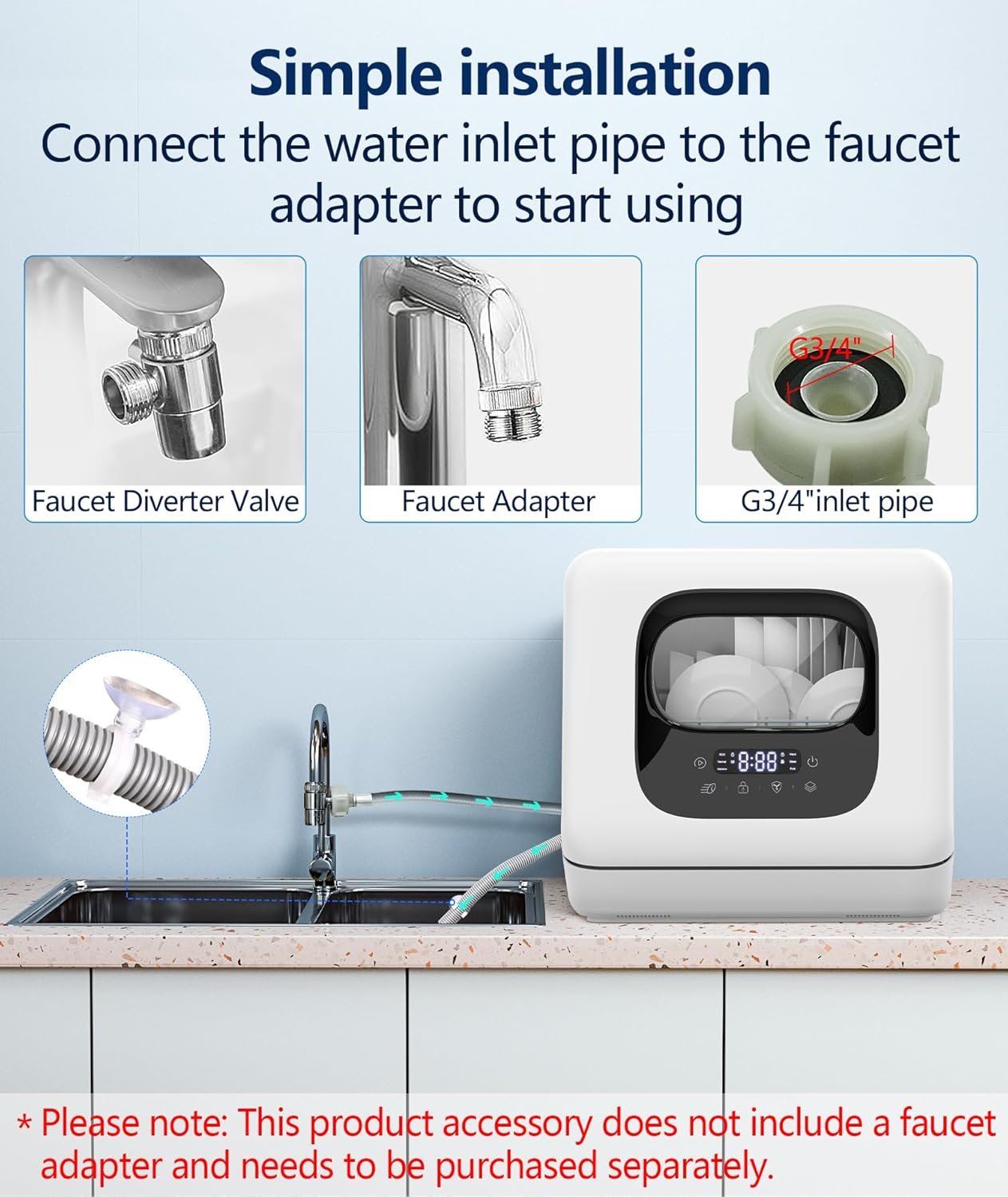 Please Note:Please check whether the supplied inlet hose is suitable for your faucet. If not, please purchase a faucet adapter for connecting.