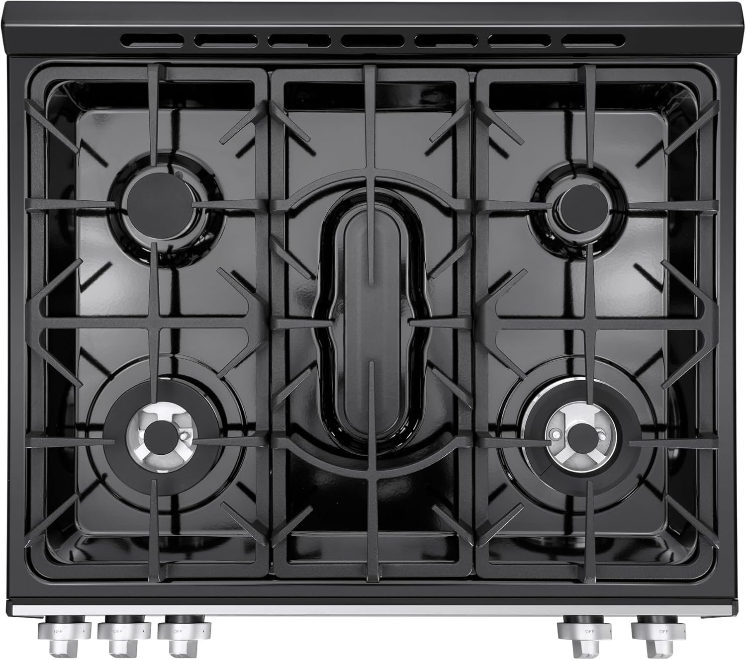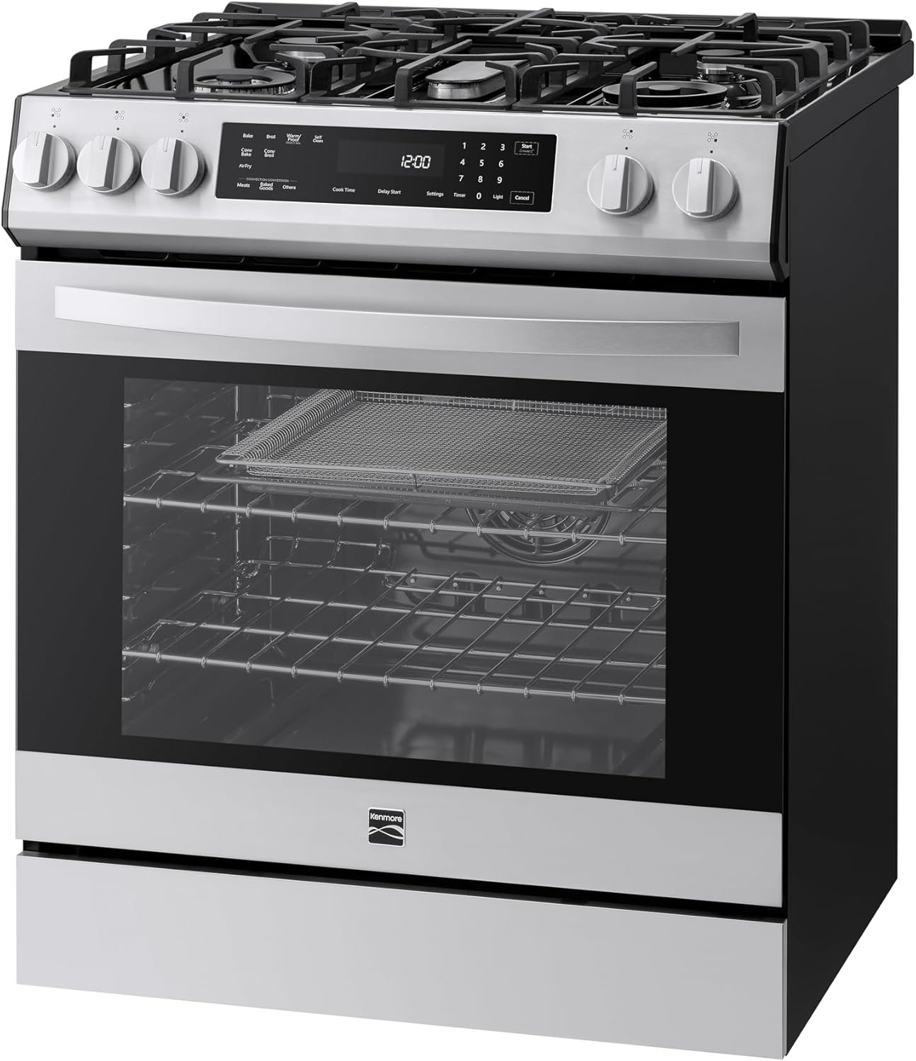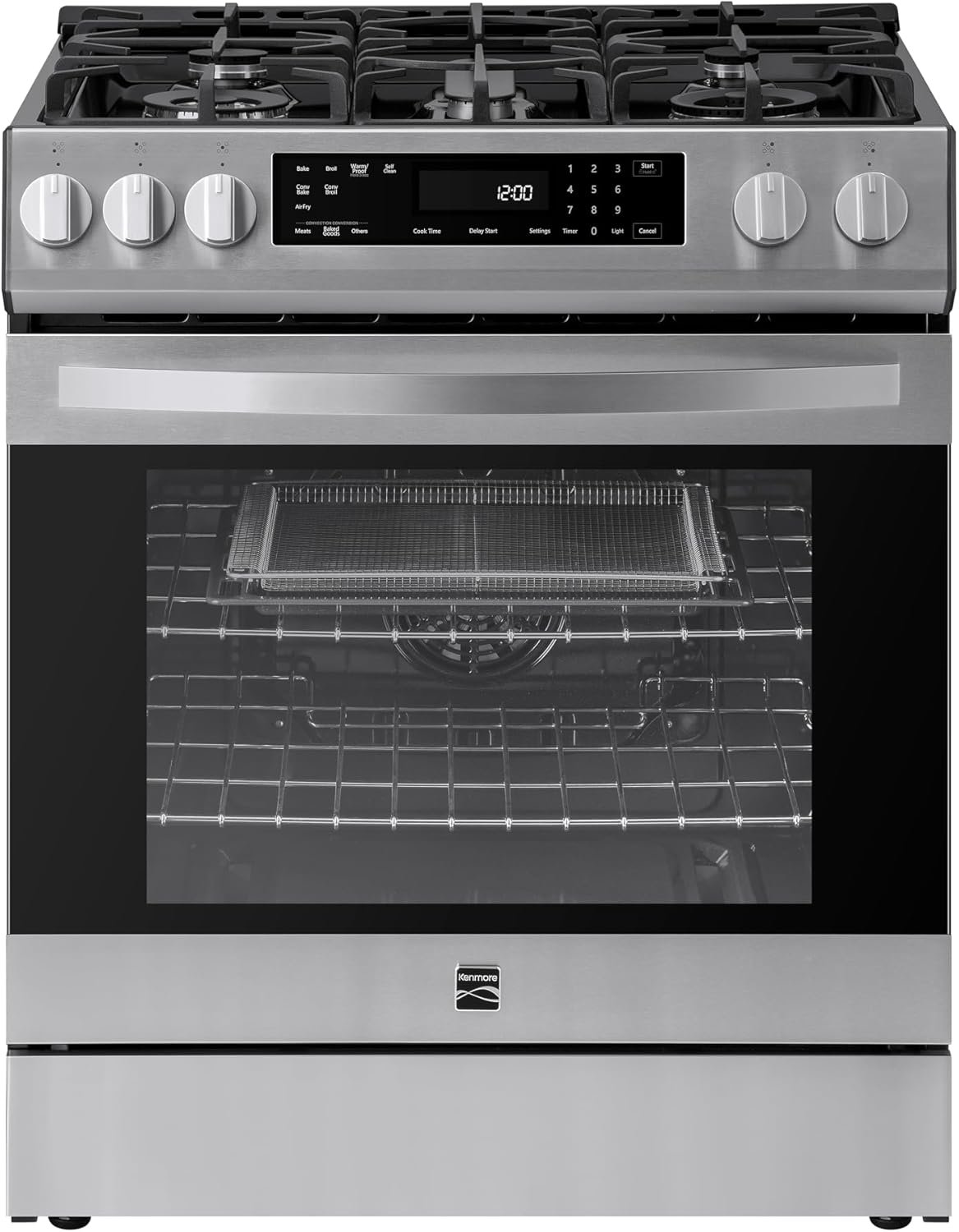 The Kenmore 5.6 cu. ft. Front Control Convection Gas Range combines style, versatility, and performance for every meal. Its sleek, front control design makes it easy to reach the controls without having to reach over hot skillets or flames. The five cooktop burners include two triple rings and our 19,000 BTU Turbo Boil Plus burner. The simmer burner delivers a low 900 BTUs, perfect for melting butter or chocolate. Inside, the hidden bake element maximizes oven space, and the seamless oven floor makes cleaning easier. The Fan Convection circulates hot air throughout the oven for even cooking. The broil function quickly adds a browned crust and flavor to your dishes. A large oven window lets you easily check your food without opening the door, and the bright halogen light illuminates the interior for better visibility. A convenient storage drawer below provides space for cookware, while ultra-durable chrome racks support heavy dishes. The dishwasher-safe porcelain-coated cast iron grates make cleanup simple, and an LP kit is included for easy conversion in areas without natural gas.