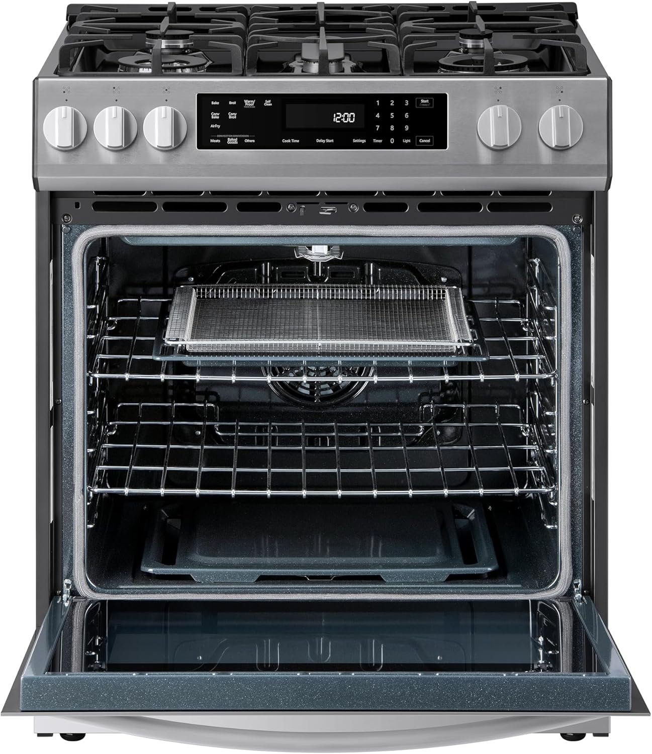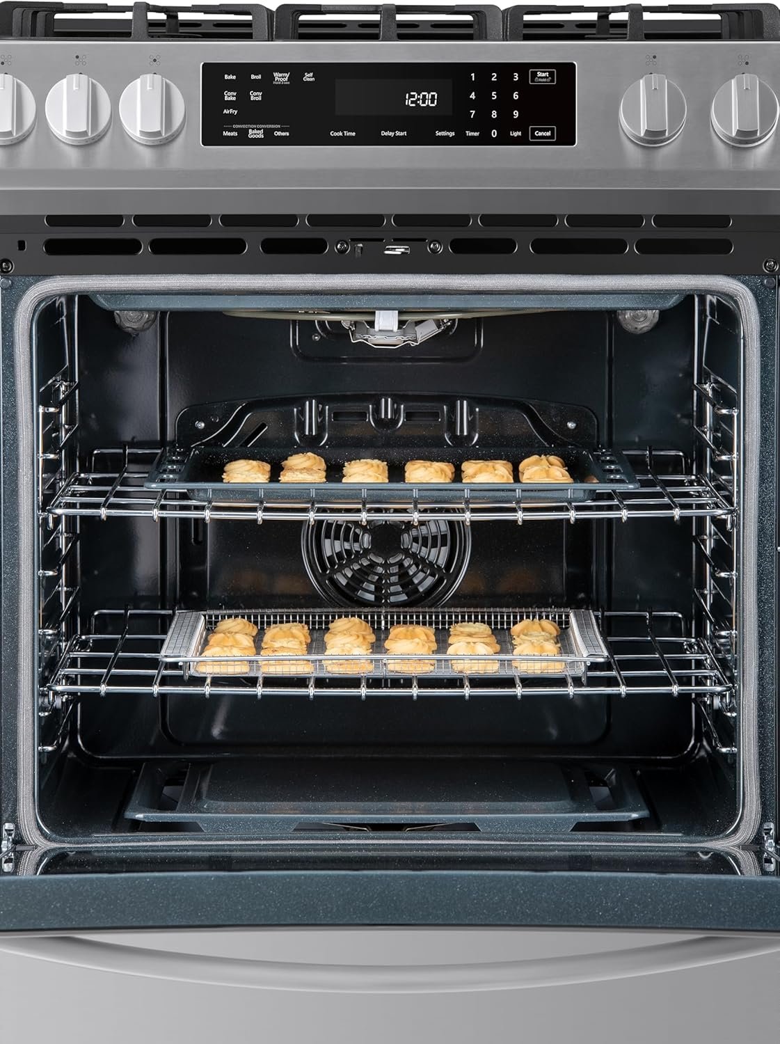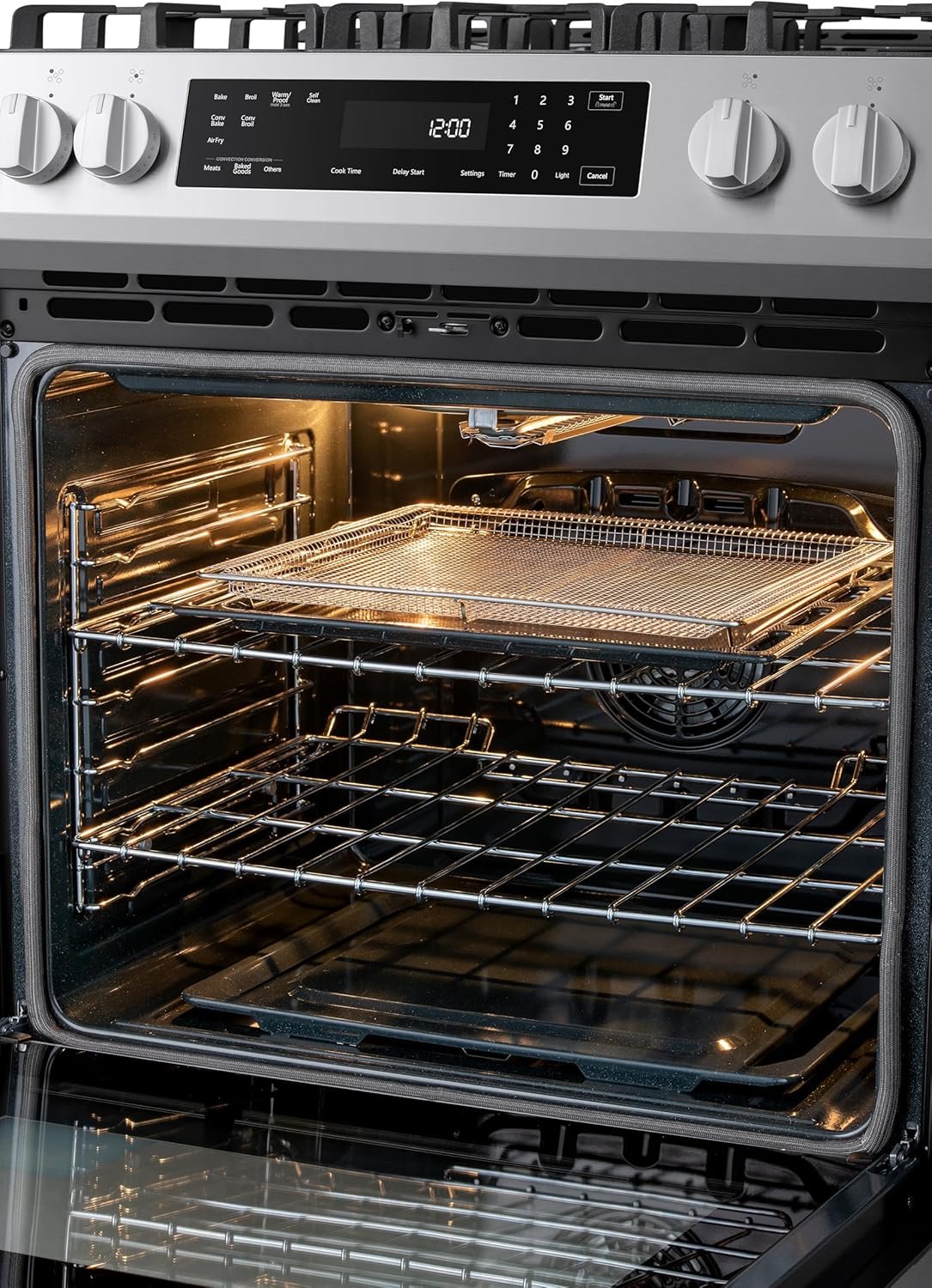 CONVECTION FAN SYSTEM: Circulates hot air throughout the oven for even and precise cooking on every rack; the Air Fry setting with basket uses hot circulating air to create crowd favorites