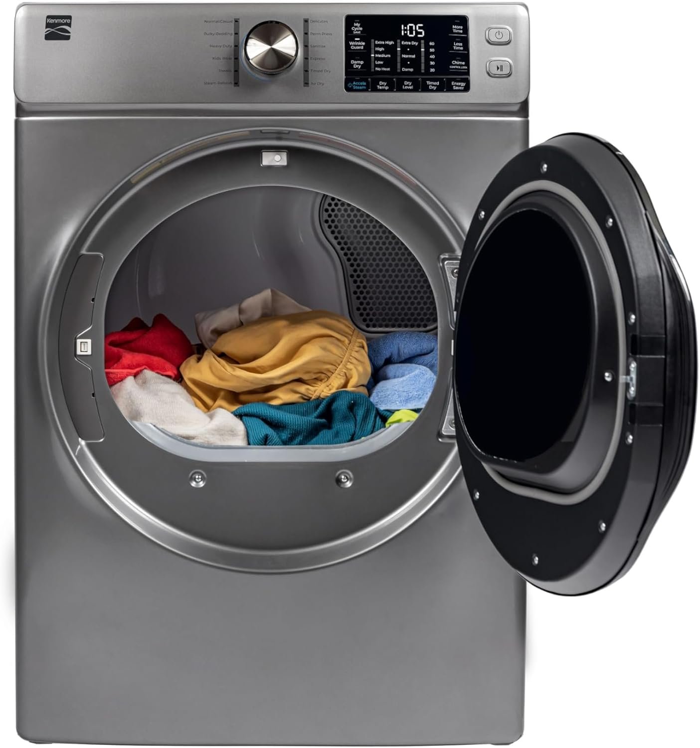 Introducing the Kenmore Front Load Electric Dryer with Steam, designed to deliver exceptional drying performance and convenience while caring for your clothes and the environment. With a spacious 8.0 cu. ft. capacity, this dryer accommodates large loads and bulky items like bedding, giving them ample room to dry efficiently. Equipped with a Smart Sensor Drying System, this dryer uses advanced sensors to detect moisture levels in your clothes, adjusting drying times to prevent over-drying and ensure your garments look and feel their best. The Energy Saver option enhances efficiency by reducing energy use by up to 8.2% compared to the Normal cycle alone, helping you save on utility bills while being eco-friendly. For items that can’t be washed, the Sanitize cycle provides a powerful solution, removing germs from non-washable items such as decorative pillows, sleeping bags, and plush toys. Using Accela Steam technology, the Steam Refresh cycle reduces odors and relaxes wrinkles in just 15 minutes, meaning less ironing and more free time. Accela Steam technology creates steam that enhances the performance of steam cycles and options to reduce wrinkles, odors, and static cling, ensuring your clothes come out looking fresh and ready to wear.