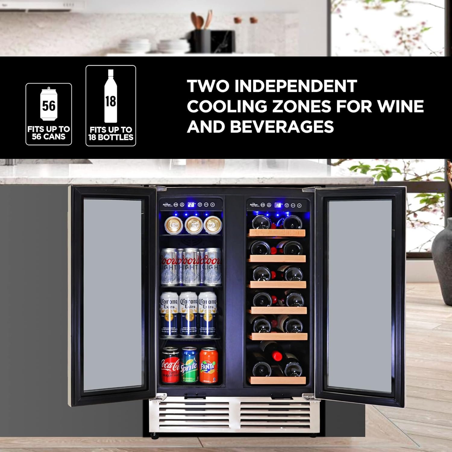 TWO INDEPENDENT COOLING ZONES FOR WINE & BEVERAGES – The Koolatron 18 Bottle and 56 Can Dual Zone Wine Cooler offers two independent cooling zones, allowing you to customize the temperatures for up to 56 regular or tall beer or soft drink cans in the left chamber & 18 Bordeaux bottles in the right. With individual digital touch screen controls, it is perfect for both a beverage refrigerator & a wine cooler, catering to diverse storage needs, ensuring optimal conditions for all your drinks.