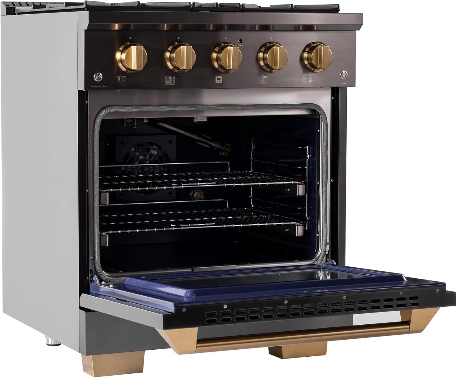 New Kucht Gemstone KEG Series – the epitome of luxury and style in your kitchen! With a sleek, darker stainless steel finish and gold assets, this range will elevate the look of your kitchen to a whole new level. This premium gas range features powerful burners, each manually controlled by gold knobs, allowing you to cook with precision. The heavy-duty cast iron grates provide a sturdy and stable surface for all your pots and pans, while the spacious oven offers plenty of room for baking, and roasting your favorite dishes. The shorter kickplate design unveils a fancy set of squared gold legs, matching the knobs and the handle. But it’s not just about the looks and performance – the Kucht KEG series is also built to last. Made with high-quality materials and designed to withstand the rigors of daily use, this range will be a reliable and durable addition to your kitchen for years to come.