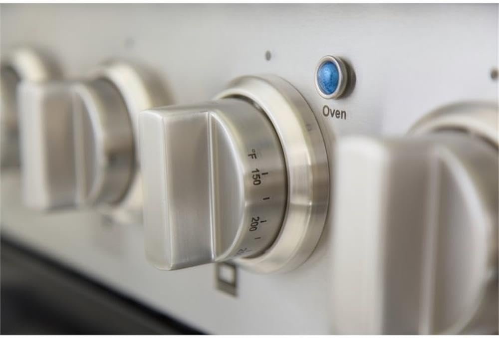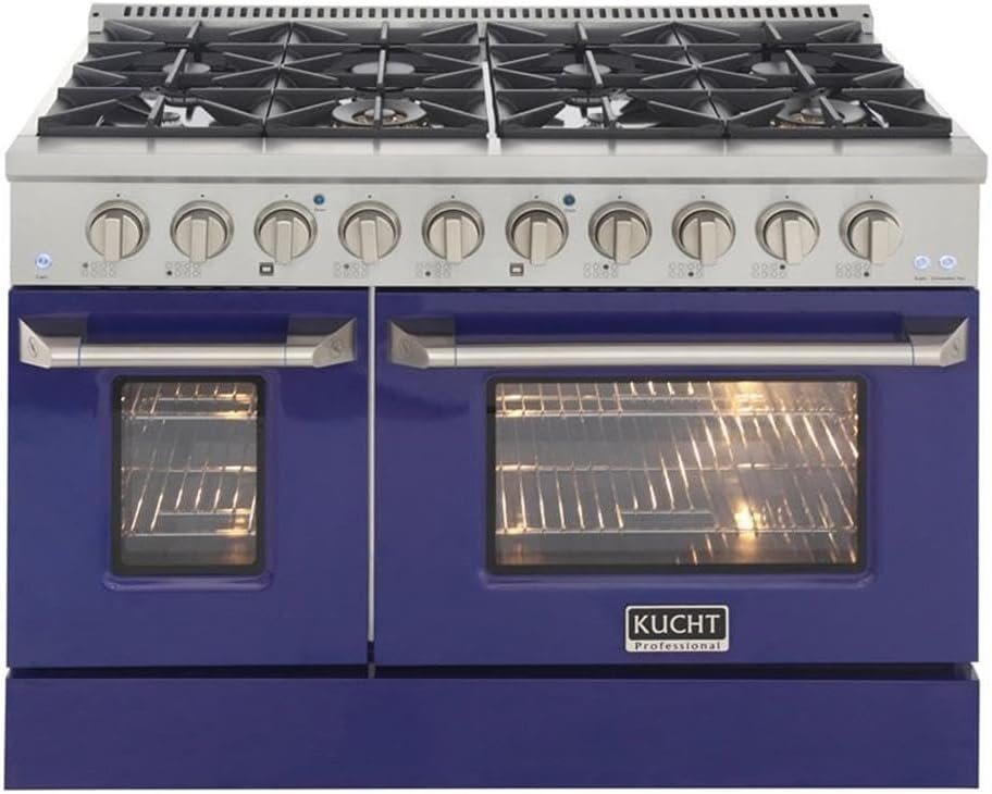 As with all Kucht ranges, the attention to detail coupled with old-world craftsmanship will transform your present home cooking area into a quality kitchen any professional chef would be proud to have in their own restaurants. The 48 in. wide Kucht top of the line model boasts two separate ovens, the main is a heavy-duty blue porcelain 4.2 cu. ft. 22,000 BTU convection oven with a 10,000 BTU tube burner broiler. The main feature of this series is the abilty to the change the look of your kitchen in less than 2 minutes by changing the color of the oven door and the kickplate. You can get a new color set (oven door and kickplate) for a really low price and change it whenever you like. The currently available colors are: Red, Blue, White, Green, Black and Silver. Add a set of colors knobs, and get the most of it by mixing and matching. 4th of July? Christmas? Your kitchen decor will be ready in 2 minutes!