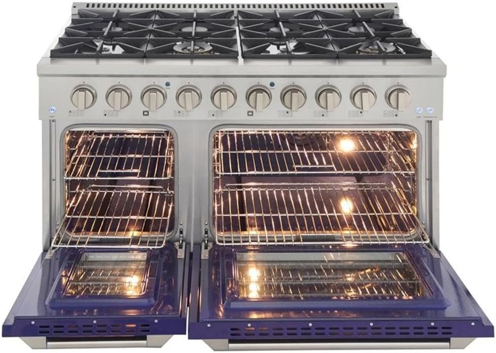 Cook and bake like a pro with 2 separate ovens with large oven windows, the main is a heavy-duty blue porcelain oven with 4.2 cu. ft. of capacity while the additional side oven has 2.5 cu. ft.