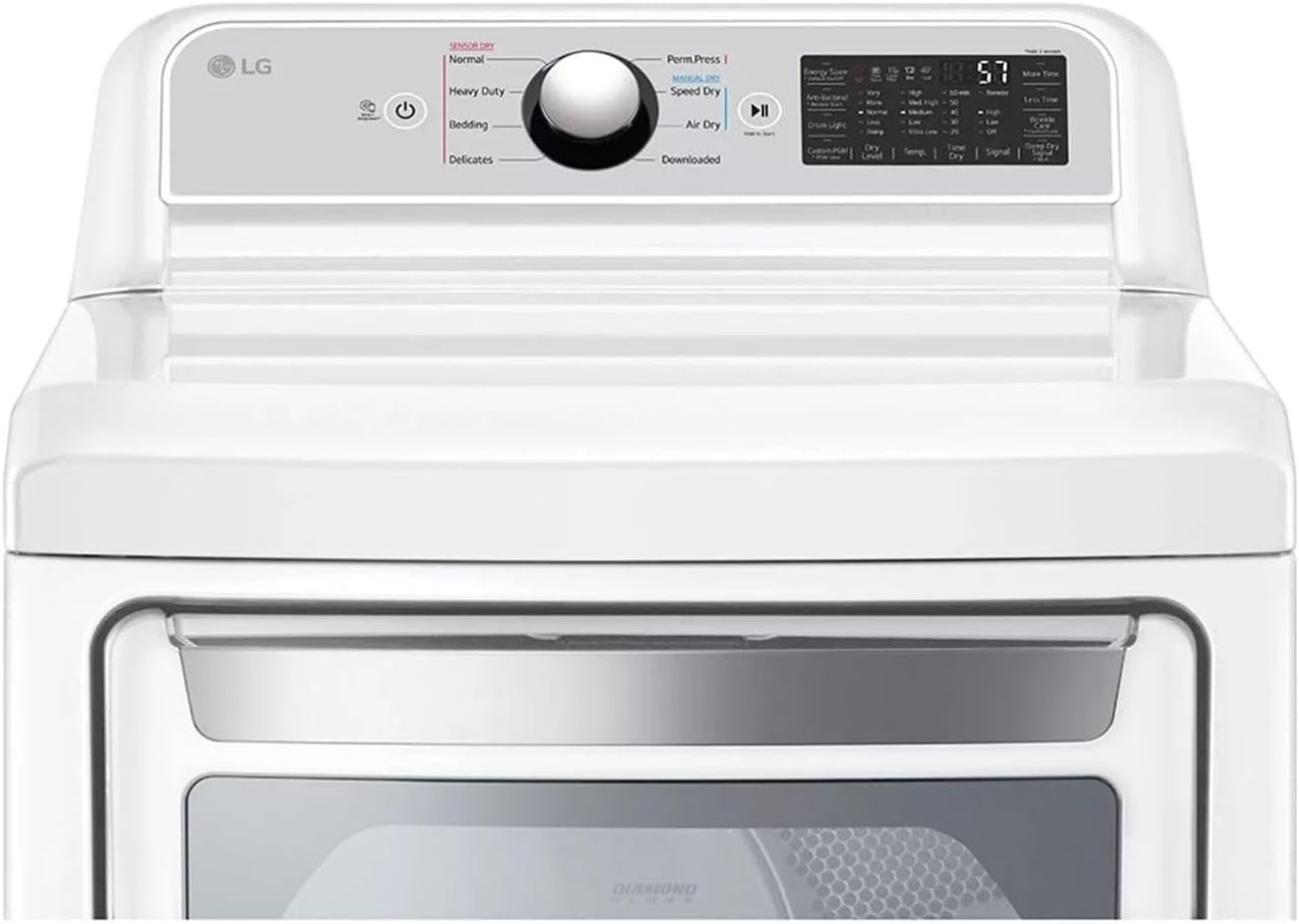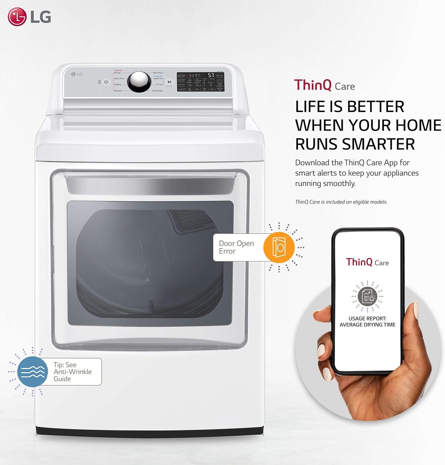 7.3 cu. ft. Ultra Large Capacity EasyLoad Door ThinQ Technology with Proactive Customer Care Sensor Dry FlowSense Duct Clogging & Lint Filter Indicators STAR Certified Aluminized Alloy Steel Drum LoDecibel Quiet Operation SmartDiagnosis Reversible Door Wrinkle Care Option