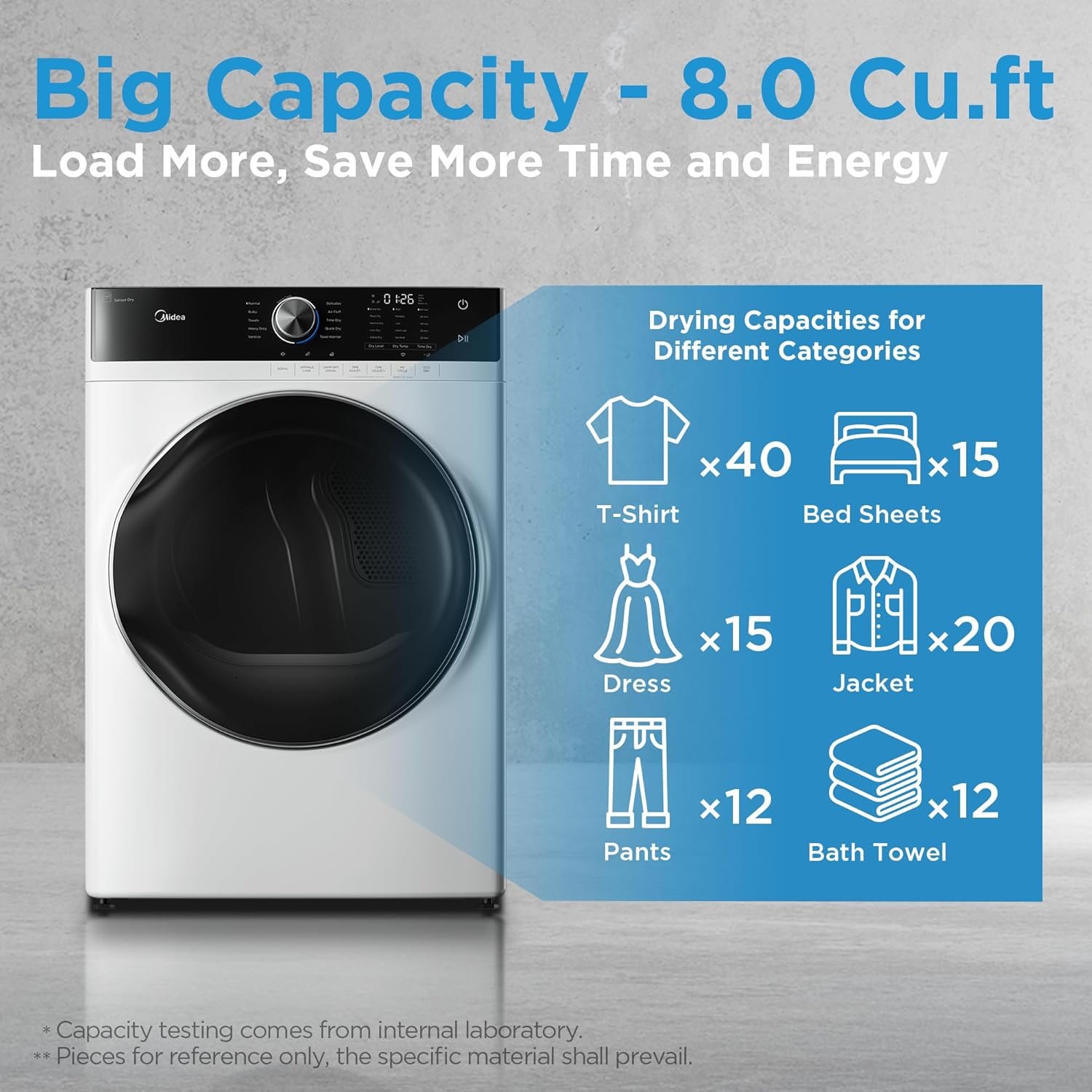 Large capacity in a standard width. Our versatile, 8.0 Cu. Ft. Dryer has 10 cycles, 5 temperature settings and a convenient auto-dry feature. The reversible door can be adjusted to open from the left or right for maximum placement versatility.