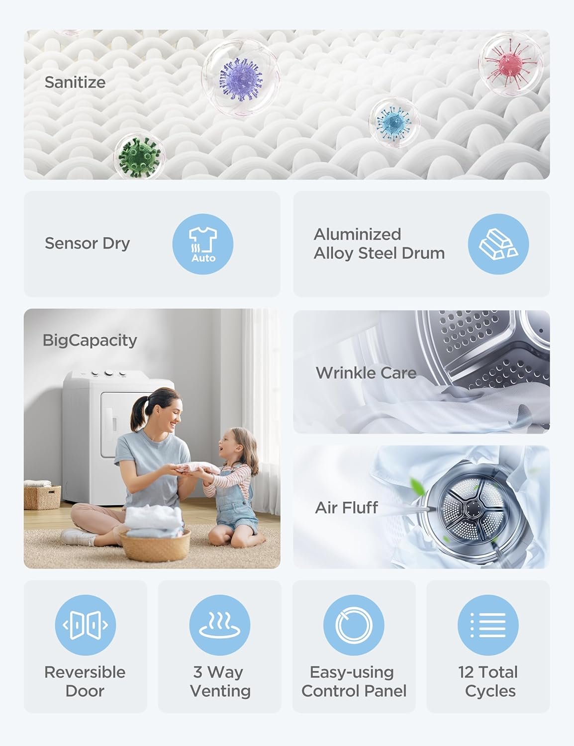 6.7 Cu. Ft. Capacity: Dry everything at once including king-size comforters, towels and linens with the extra-large drum. 12 Total Cycles: 6 Sensor Dry: Normal, Delicates, Casual, Towels, Sanitize and Heavy Duty 6 Manual Dry: 20 min, 40 min, 60 min, 80 min, Quick Dry and Air Fluff