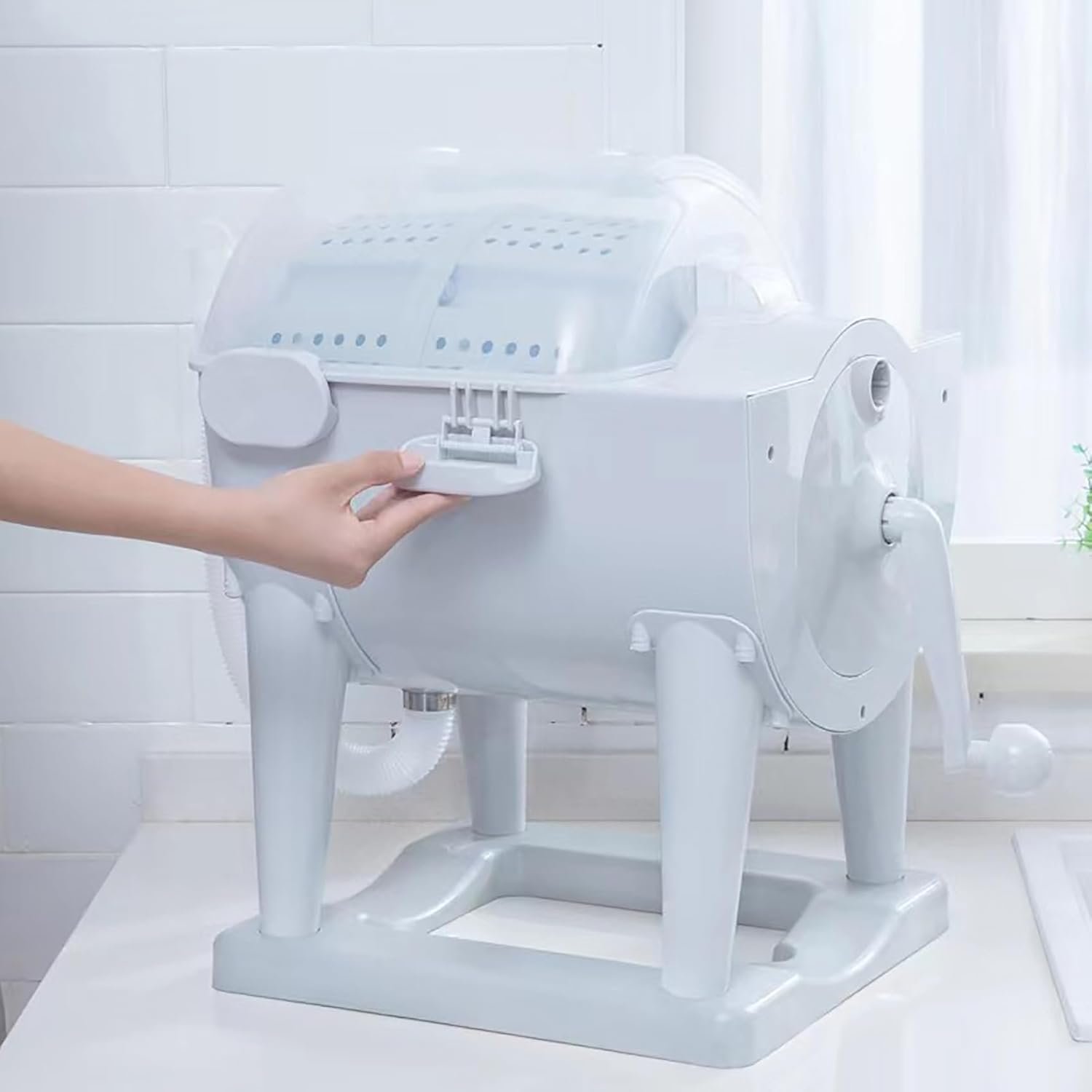 Non-electric washing machine — The manual crank operation of the compact hand powered laundry spinner does not use electricity and can be used for a variety of needs from home use to outdoor and emergency use during disasters.