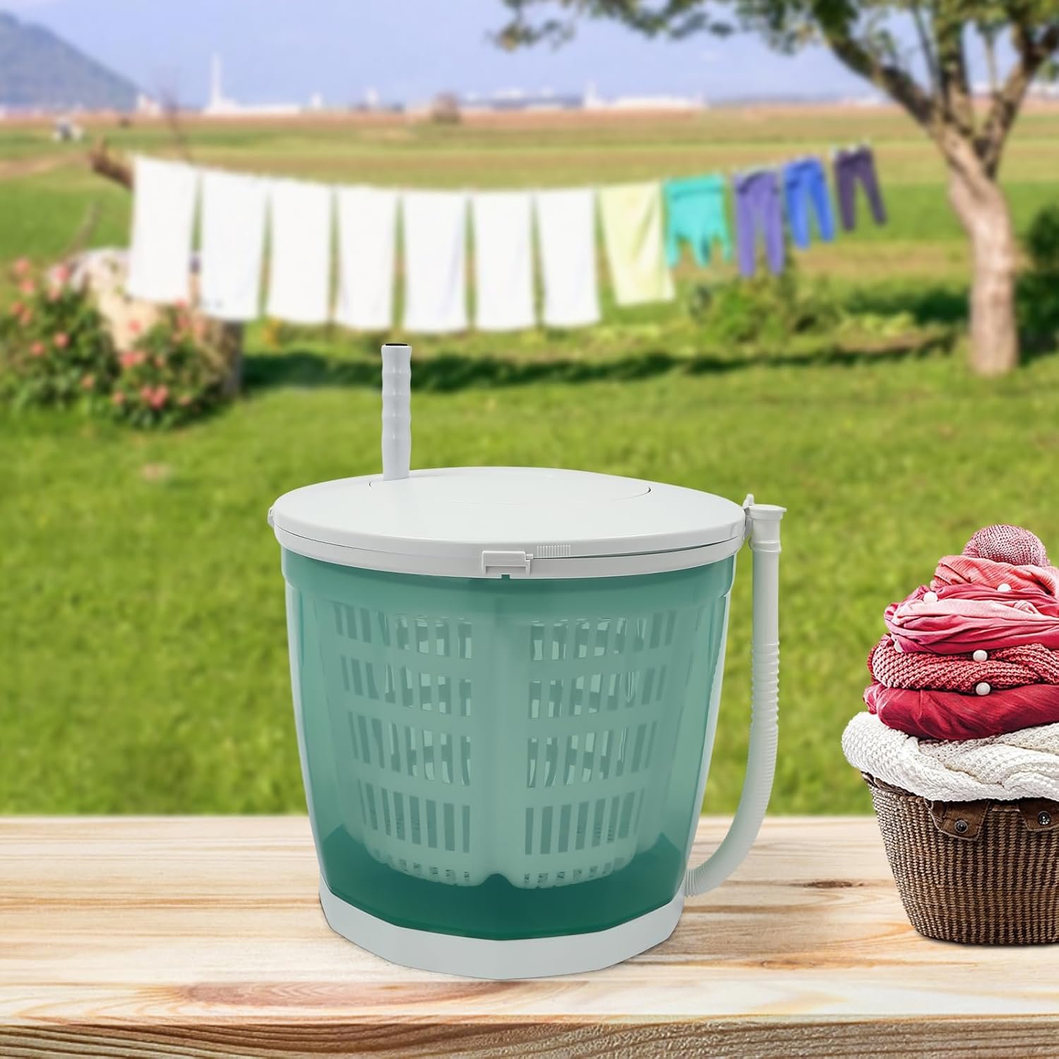 🧺【Application】This 2 in 1 manual washing machine can be used to spin clothes weighing up to 4.41 lbs. It has a plugless design and is lightweight, so it can be used both indoors and outdoors.