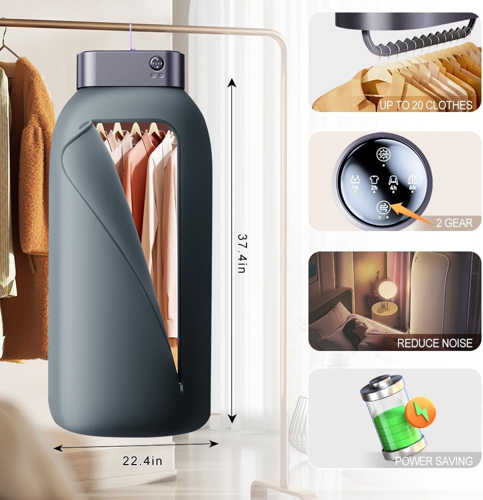 This Clothes Dryer is a fantastic option for limited space or who frequently travel. It offers multiple time settings, providing flexibility based on your drying needs. Additionally, itâs energy-efficient and operates with a small noise, making it convenient for use at any time. Highly recommended for those seeking a portable and space-saving laundry solution!