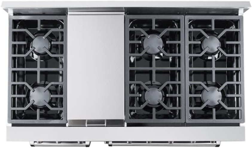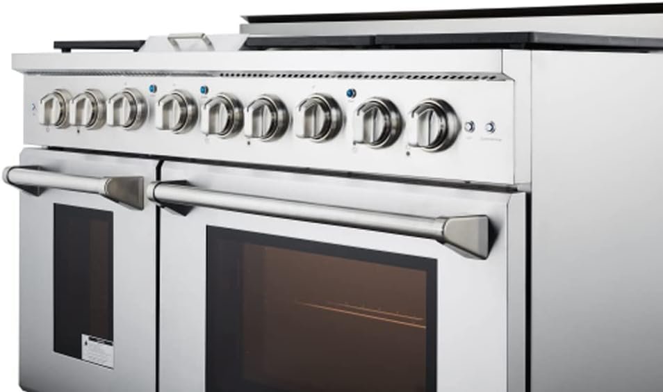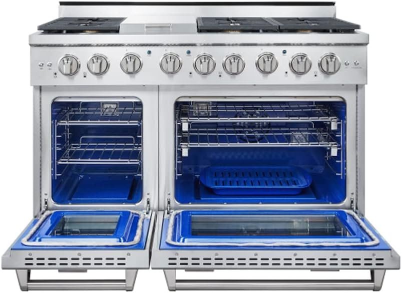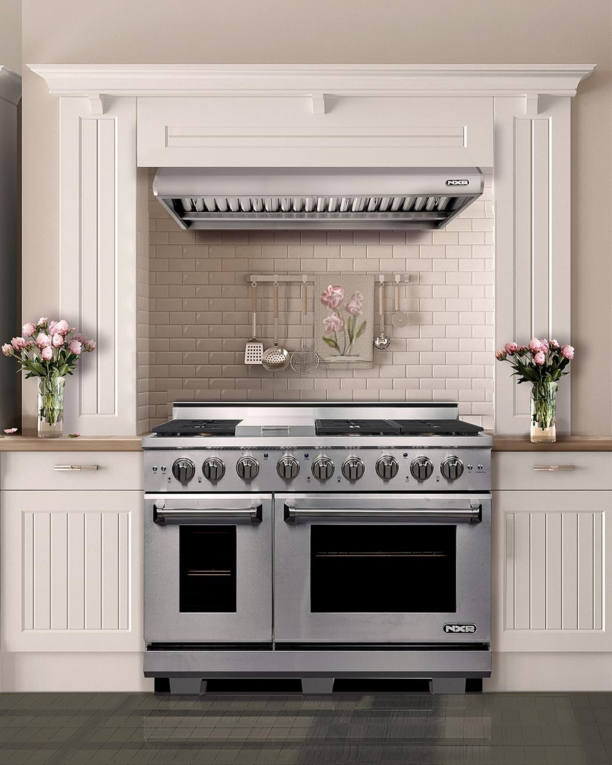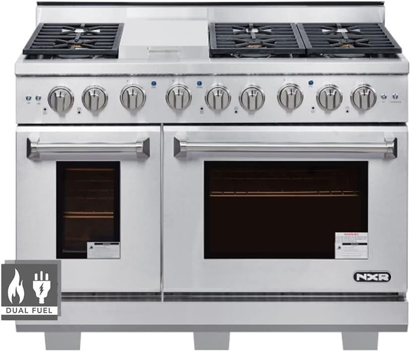 48 Inch Professional Dual Fuel Range with 6 German Tower Dual Flow Burners The center of your kitchen’s scene, the 36-inch NXR Culinary Series stainless steel professional range offers six German dual power, 81,000 BTU hobs over a convection oven that is built to complement any kitchen setup. Feel at home no matter which way you cook, with our powerful gas cooktop and electric oven. The burners come with an elegant black porcelain drip tray, flat continuous cast-iron grates, and the versatility of both high power and ultra-low simmer for ultimate cooking performance. Our convection oven features even cooking results in less time, a powerful Incoloy element broiler, extra-smooth adjustable gliding racks, and a beautiful blue porcelain interior for easy cleaning. The 48 range features professional knobs, hinges, and towel bar handles surrounded by LED-backlit knobs. NXR brings affordable luxury into your home.