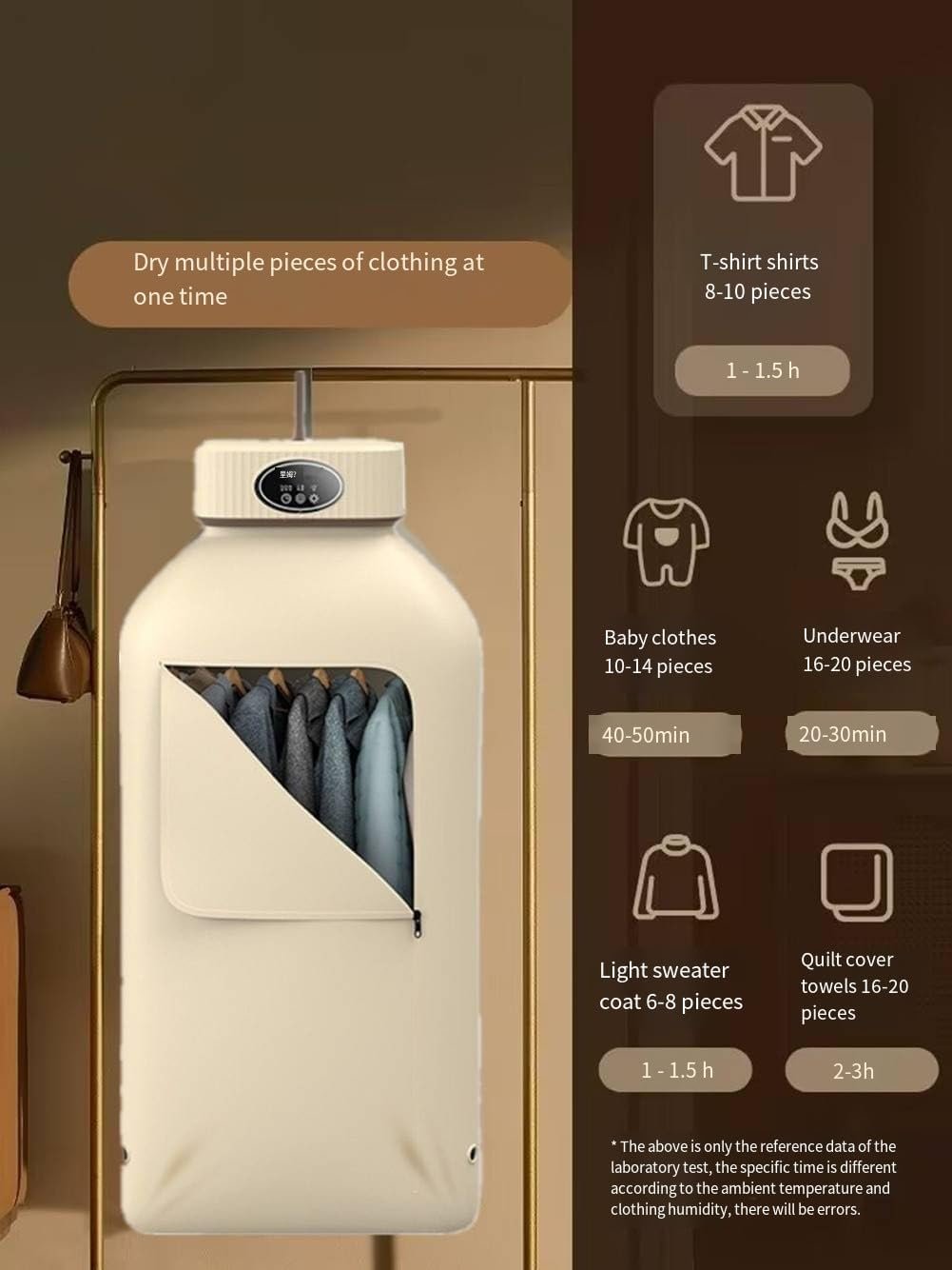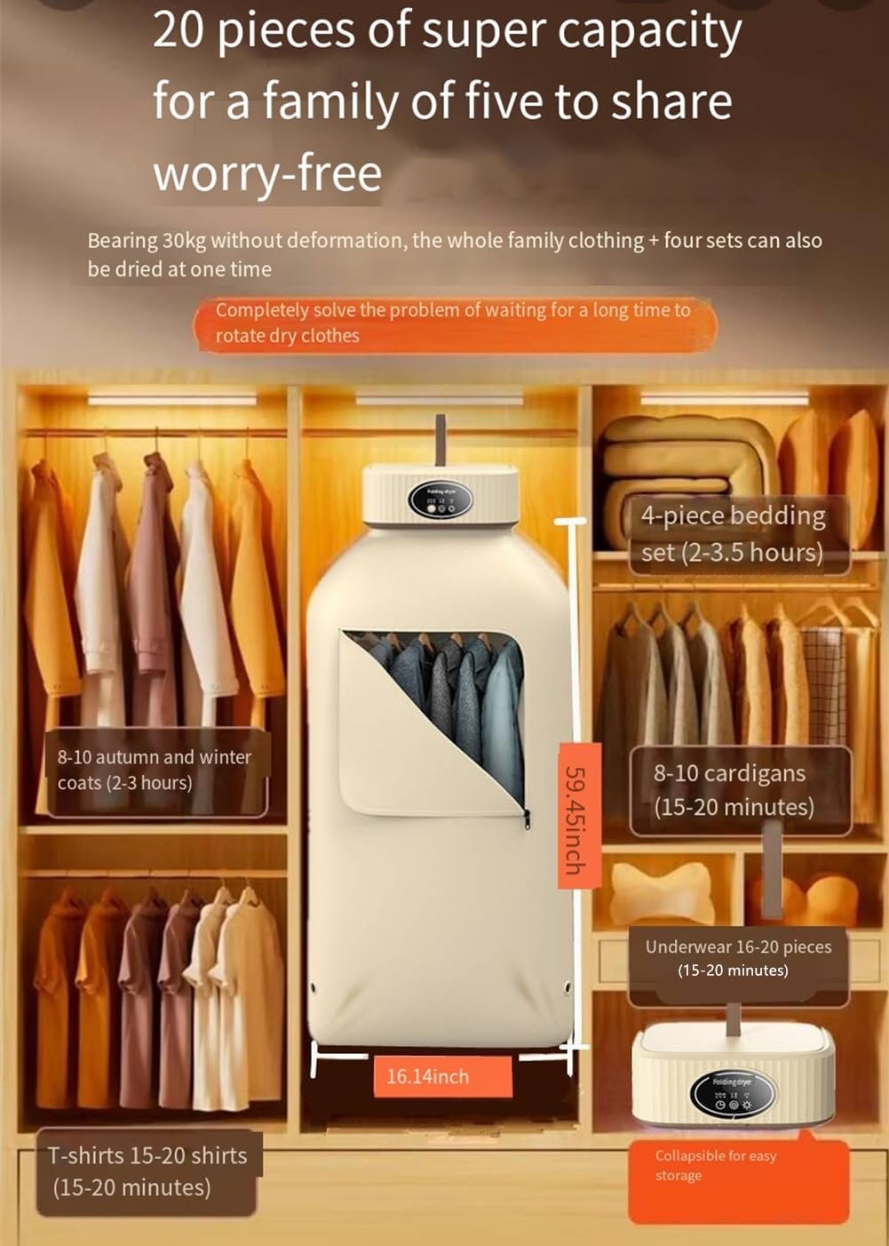 Lightning-Fast Drying: Experience the power of our innovative electric portable clothes dryer. With a unique combination of heat and airflow, it dries up to 9 clothes in just 20 minutes, getting you ready in no time.
