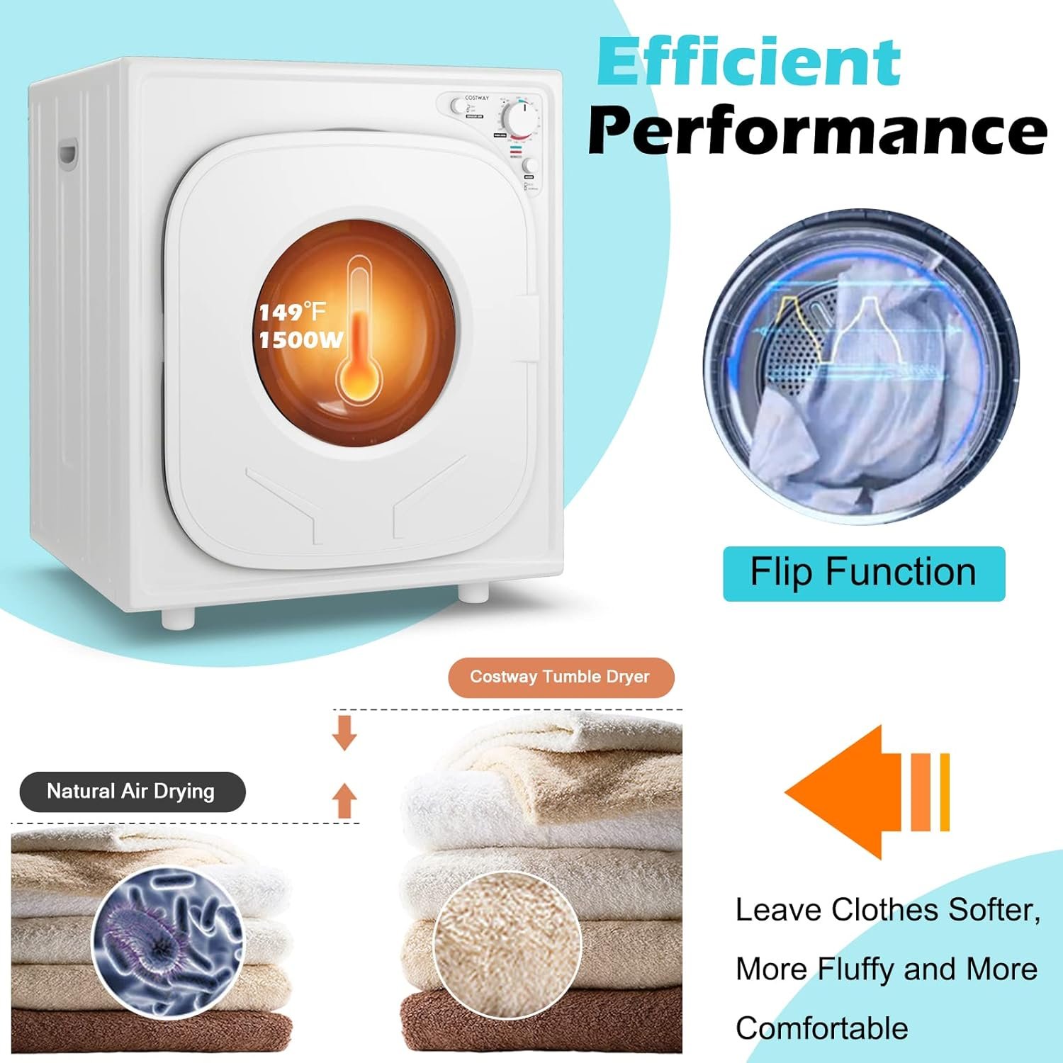 【Efficient Performance:】Boosting a 13.2 lbs laundry capacity, this front load portable clothes dryer can dry different kinds of clothes of the whole family. With its 1500W power and 149℉ maximum temperature, this laundry dryer drys your clothes evenly and quickly.【This product is not sold in California.】