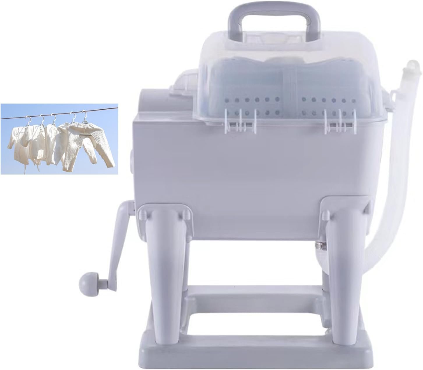 Our Portable Hand-Operated Drum Washing Machine is hand-cranked and unplugged, so you can use it at school or during a power outage.