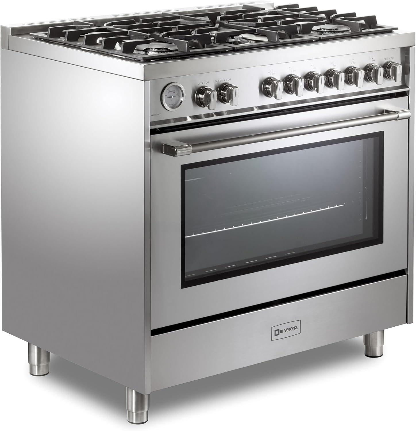 Made in Italy- The stylish Verona line of ranges, ovens and cooktops are a preferred brand of appliances featured in upscale kitchens throughout Europe since 1958. Each Verona piece is exquisitely designed and manufactured in the suburbs of Venice, Italy and stand as a benchmark for durable and beautiful Italian professional appliances. Verona products are held to stringent standards of quality unsurpassed in the industry. 36 Inch Freestanding All Gas Range, 5 Sealed Burners, 5.0 cu. ft. Total Oven Capacity, Convection, Viewing Window, Storage Drawer- Flip down, Flame Failure Safety Device in Stainless Steel – VPRFSGG365SS