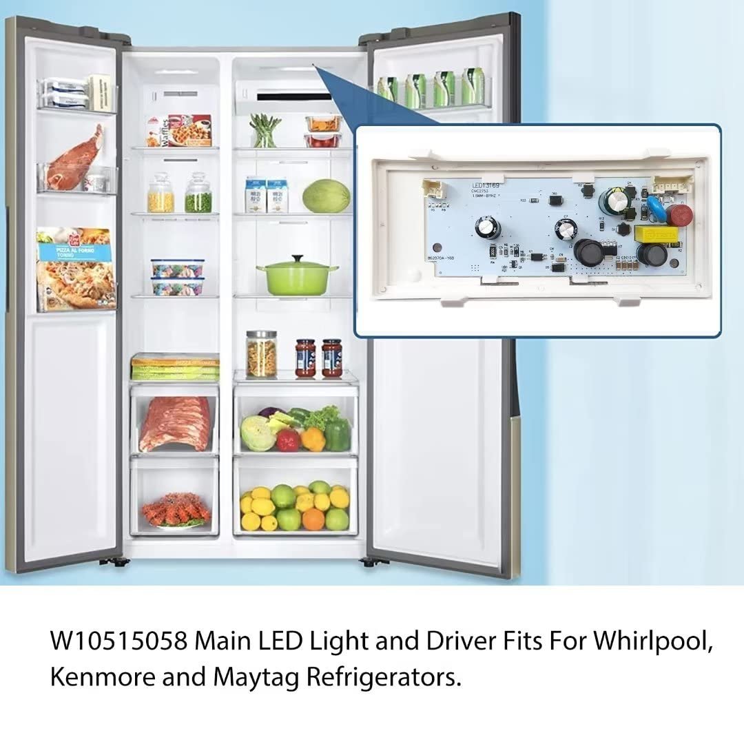 Before Purchasing this part, you must check the other two led lights in the refrigerator with part number W10515057. One is located in the mid section of the refrigerator side and the other one is located in the freezer side. If either of those LED boards have failed they must be replaced before the new main board (W10515058) may be installed. Otherwise, it will cause all of the LEDs to flicker, dim or not illuminate at all. W10515058