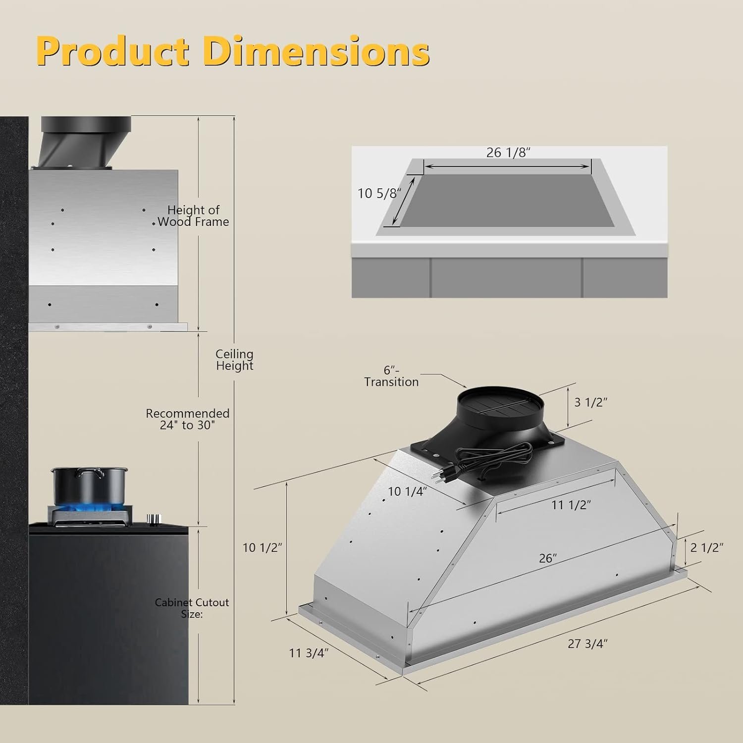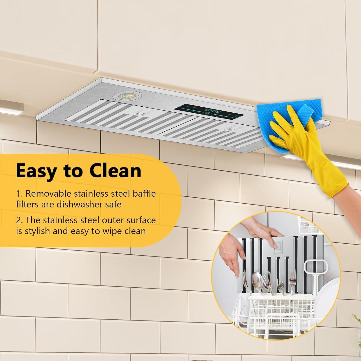 Stainless steel range hood insert with a modern design and built-to-last quality, is easy to install and saves your kitchen space, making it a great addition to any kitchen. 3 stainless steel filters are designed to snap quickly apart, ready to be placed directly in the dishwasher or even hand washed with warm, soapy water