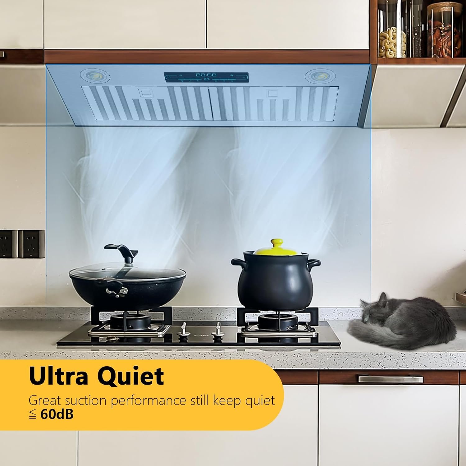Two bright and adjustable LED lights under insert range hood 30 inch provide you with sufficient light so that you can clearly observe each details of vegetable and meal. Meanwhile, the noise level at the highest speed is low at 60dB, bringing you a quiet cooking zone