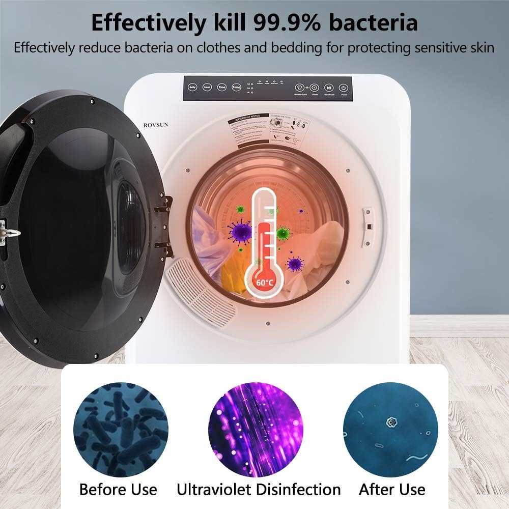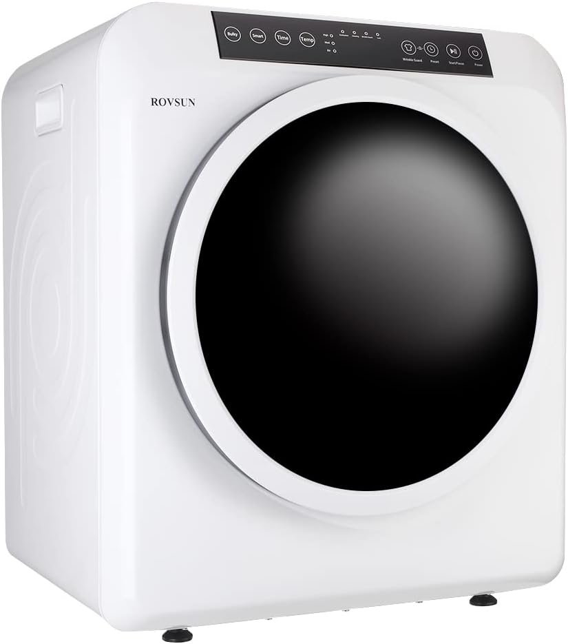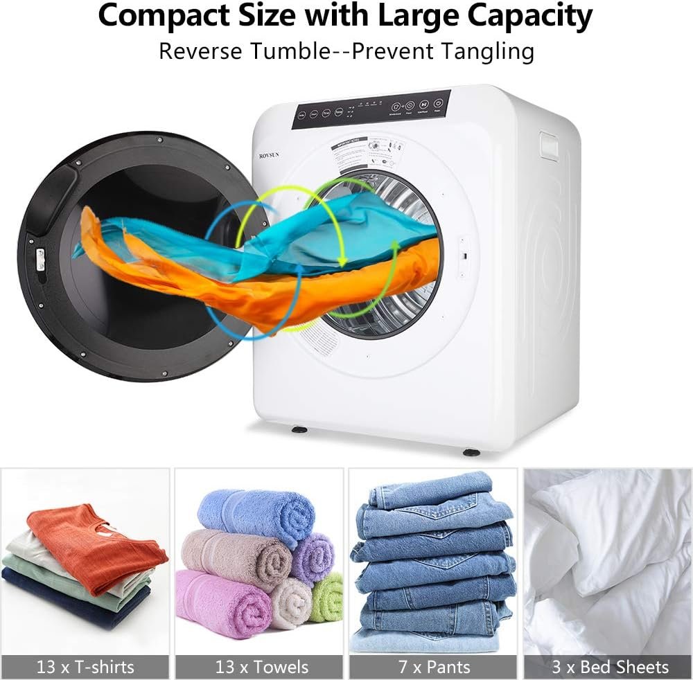 This ROVSUN portable washing machine uses forward and reverse drum movements to easily rotate, prevent tangles, effectively remove wrinkles, restore fluffy and comfortable fabrics, and moderate temperature. Energy-saving and efficient operation. This household dryer has a innovative LED touch screen. In addition, the quiet tumbling structure allows you to run the dryer during sleep or daily travel without generating too much noise. According to the material and quantity of clothing, a selection of intelligent programs is set, which is even suitable for the operation of the elderly. It can perfectly fit your apartment, dormitory room and small corner of the house. Features: 1. Superior drying performance 2. Energy saving, high efficiency and mute 3. Easy-to-use button panel 4. Portable and space-saving 5. High quality and large capacity 6. Easy to clean 7. LED touch Screen Specification: 1. Type: Compact Laundry dryer 2. Dimensions: (23.43 x 20.1 x 26.8)” (L x W x H) 3. Net Weight: 59.52lb 4. Material: Steel Stainless Steel & ABS 5. Color: White 6. Wattage: 1300w Package Includes: 1 x Dryer 1 x Instruction Manual