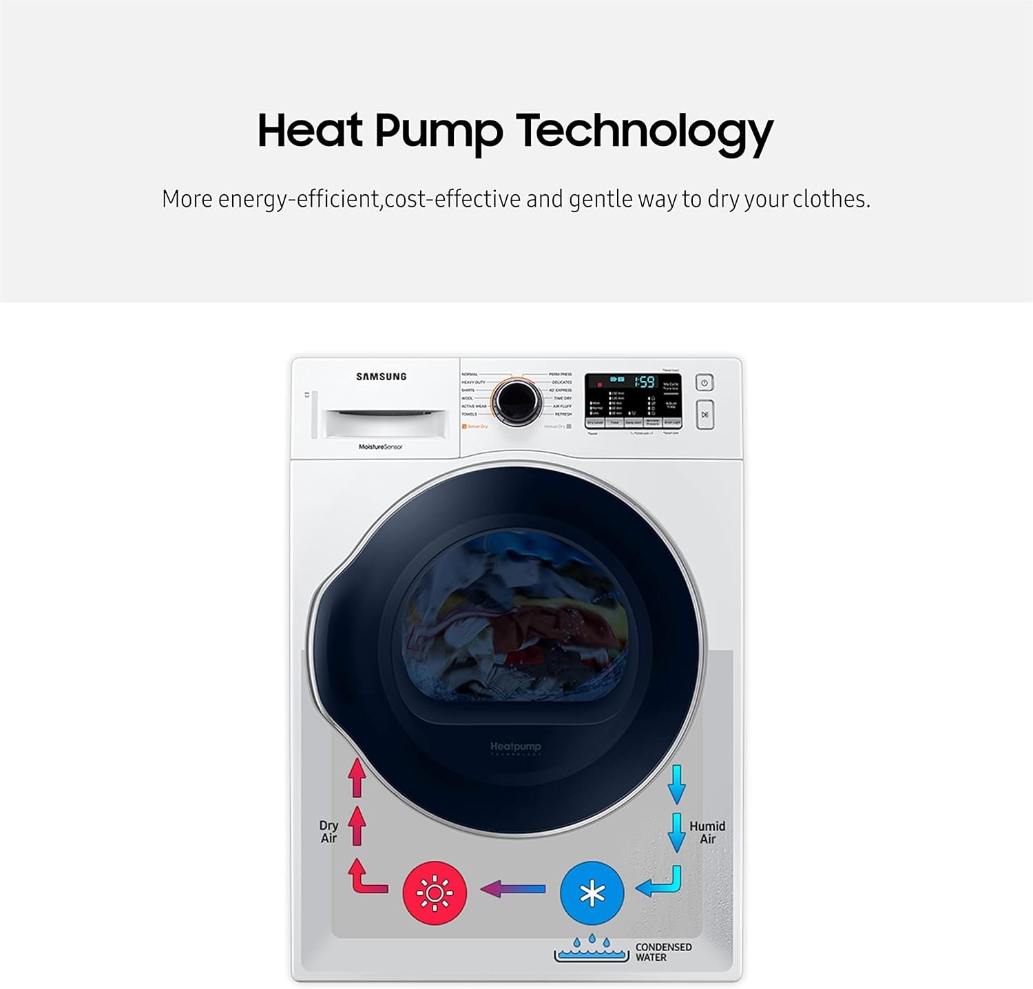 HEAT PUMP TECHNOLOGY: Samsung Heat Pump Dryer offers a more energy-efficient, cost-effective, and gentle way to dry your clothes; It uses a ‘refrigerant’ instead of electricity to heat the air and recycles the same air to avoid wasting energy