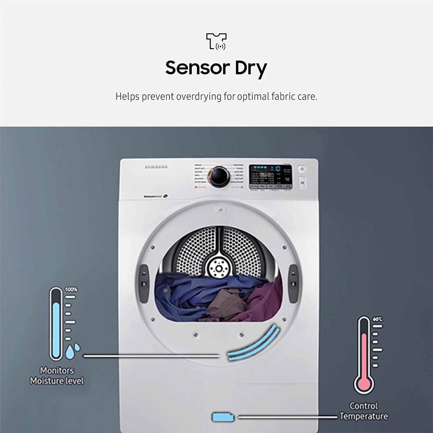SENSOR DRY: Automatically optimizes the time and temperature of your drying cycle to protect your clothes from heat damage, while avoiding excess energy use