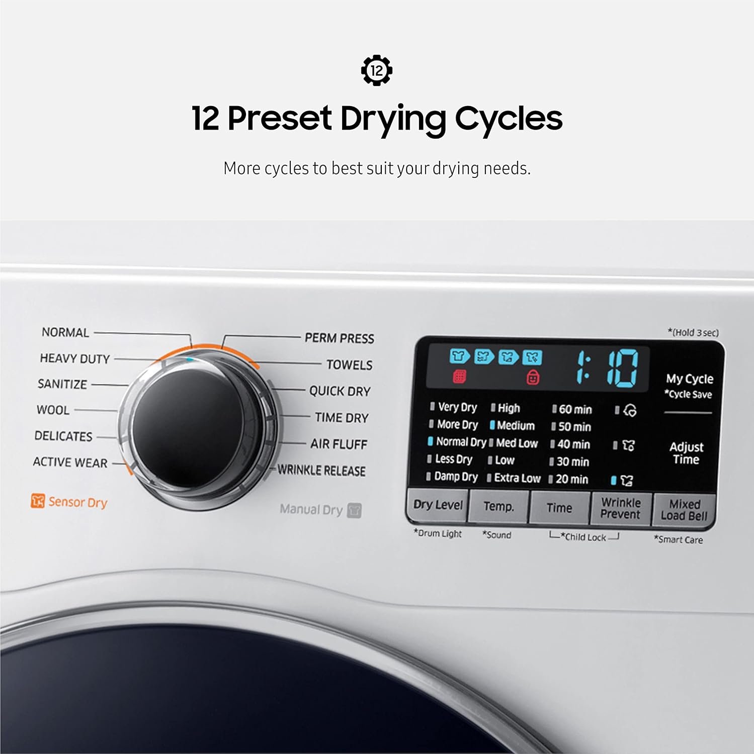 12 PRE SET DRYING CYCLES: More cycles to cover almost every drying need for your active family