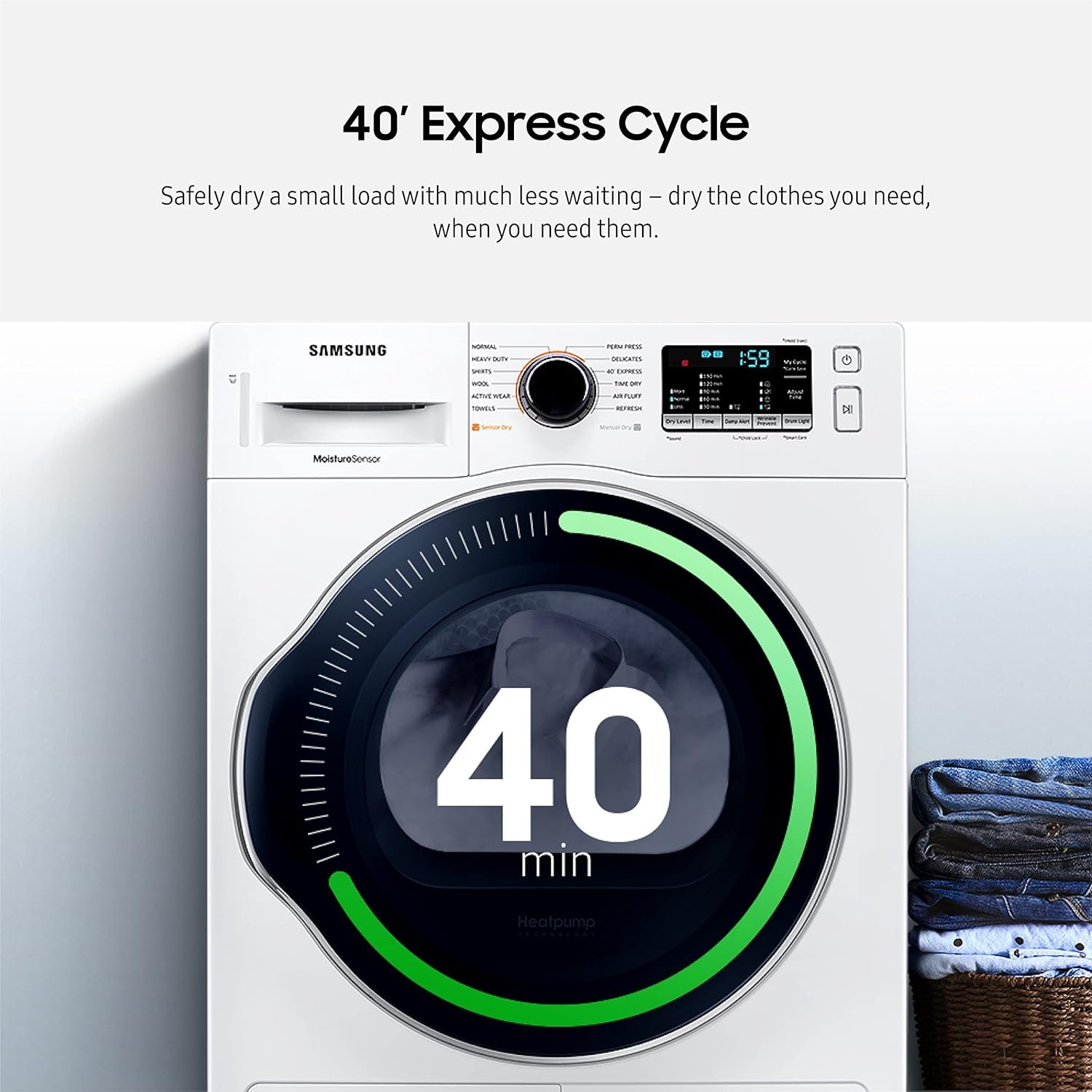 40 MINUTE DRYING: The 40′ Express Cycle gets a small 2 lb load of clothes dry and ready to wear in just 40 minutes; Safely dry a mini load with much less waiting – dry the clothes you need, when you need them