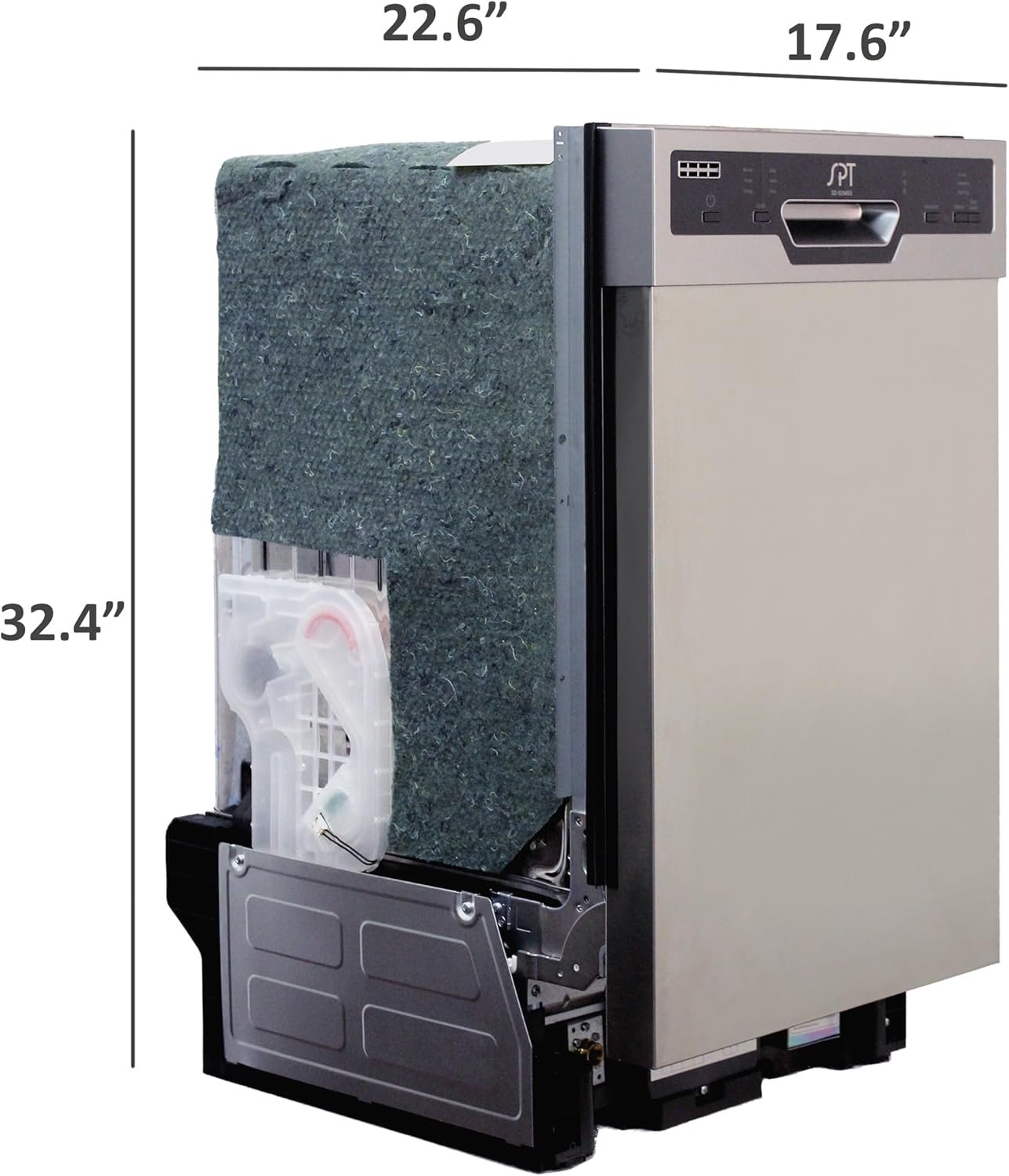 This built-in 8 place setting SMART WASH dishwasher is a great addition to any home. At 18 inches wide, this unit takes up minimal space and a great replacement for older appliances. Features 2 pull out dish racks, 6 wash programs and time delay feature. Features a brand new heating function during drying cycle for more effective drying. Features and Functions · Time Delay Feature: allows you to program operation at a later start time (1-24 hours) · Error Alarm: displays fault codes · HEATING function during drying cycle · Rinse Aid Warning Indicator: refill reminder on rinse aid. · Stainless Steel Tub · Quite Operation: at 52 dBA · Capacity: up to 8 standard place settings · 6 Wash Programs: Normal, Heavy, Energy, Glass, Quick, Rinse · Two Racks: Upper and lower racks · 2 Spray Arms: for complete cleaning coverage · Silverware Basket: holds silverware and utensils for easy cleaning · Automatic Dispensers: detergent and rinse agent · Energy Star: meets or exceeds federal guidelines for energy efficiency for year-round energy and money savings ** Unit is designed for top-mount installation (top-mount brackets included). Side mounting brackets are NOT included. ** Specifications Input voltage 120V/ 60Hz Energy consumption 234kWh/yr Water consumption (normal cycle) 2.54.9 gallons Power consumption Wash motor 100W, Heater 700W Noise level (normal) 52dB Drying system Heated drying Unit dimension 17.6″W x 22.6″D x 32.4″H Depth with door fully open 44.5 inches Package dimension 26 x 22 x 36 inches Net weight 54 lbs Gross weight 65 lbs.
