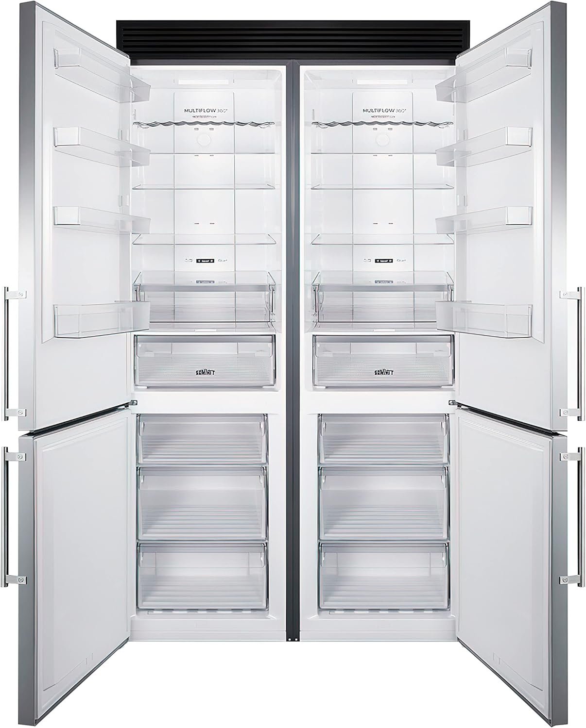Model FFBF181ES2KIT48 combines two of our ENERGY STAR certified European bottom freezer refrigerators, both sized under 24″ deep for an easy fit in shallow spaced kitchens. We ship one unit with a right hand door swing and the other with a left hand door swing, allowing you to create a French door effect for an efficient use of kitchen space. Both units feature stainless steel doors with a gentle curve and pro style handles to complete the look. We include our GRILL48B, a cosmetic top grill in black powder-coated steel to help fill standard 84″ high kitchen openings.