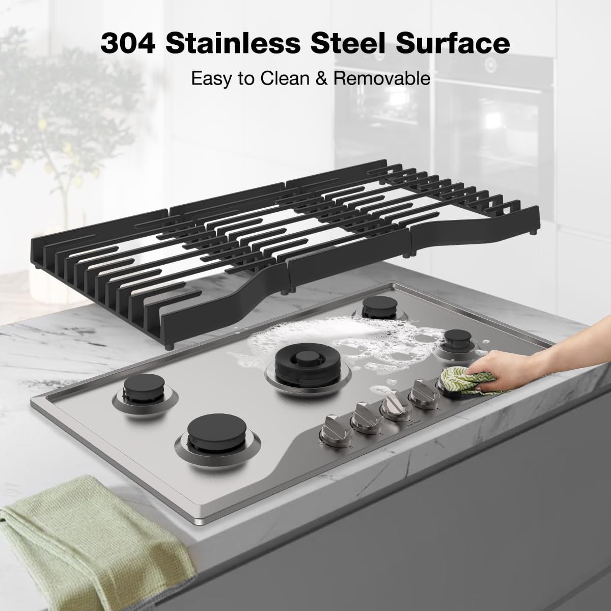 1 Minute to Clean: 0.03-inch #304 stainless steel integrally molded panel and removable dishwasher-safe cast iron grates designed for effortless cleanup, resist stains and discoloration. Sealed burners keep the food residue away.