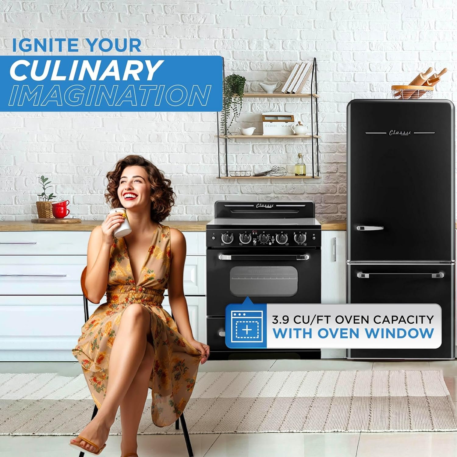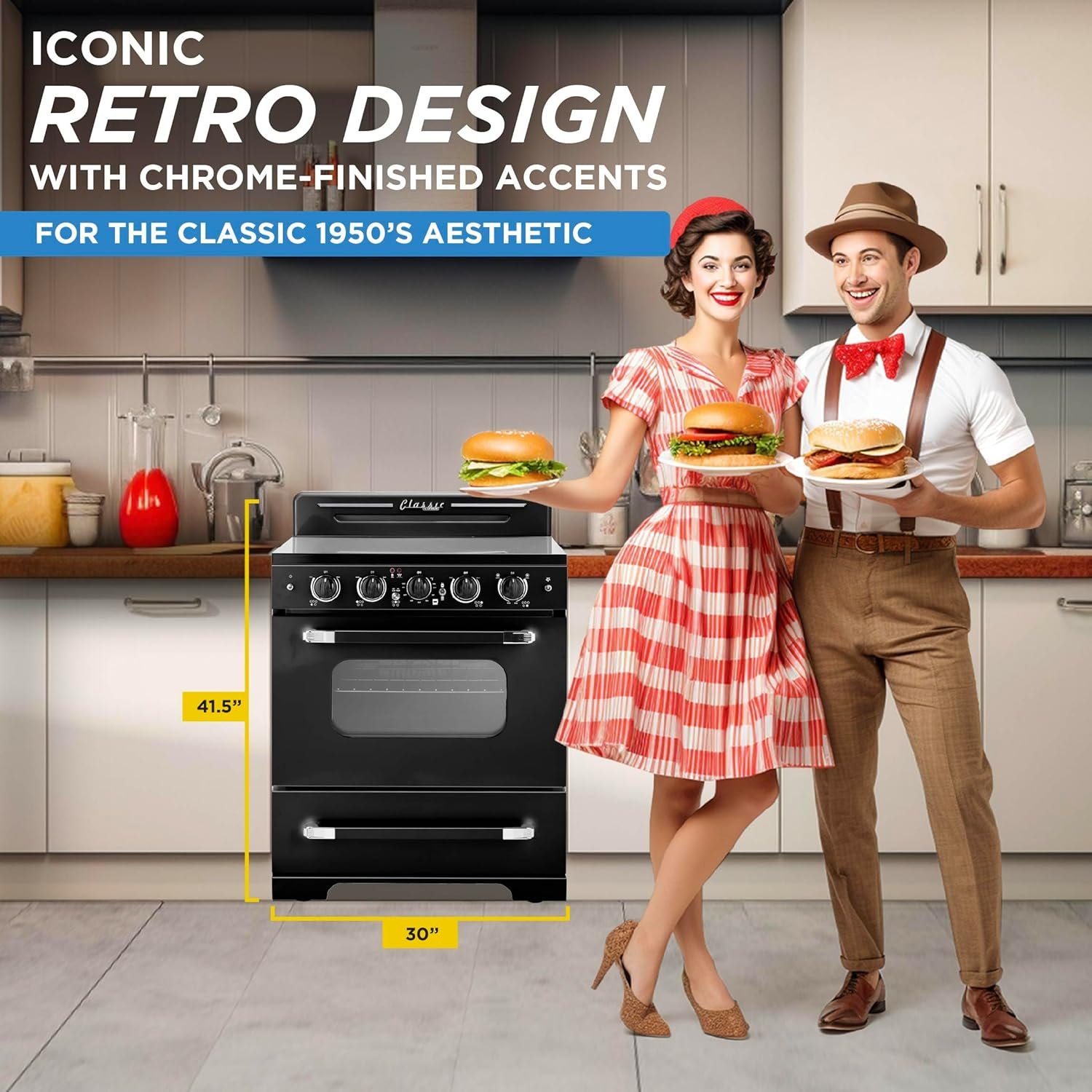 Unique Appliances UGP-30CR EC B Classic Retro Radiant Freestanding Electric Convection Oven Light, Range with 5-Element Glass Cooktop, 30″, Midnight Black