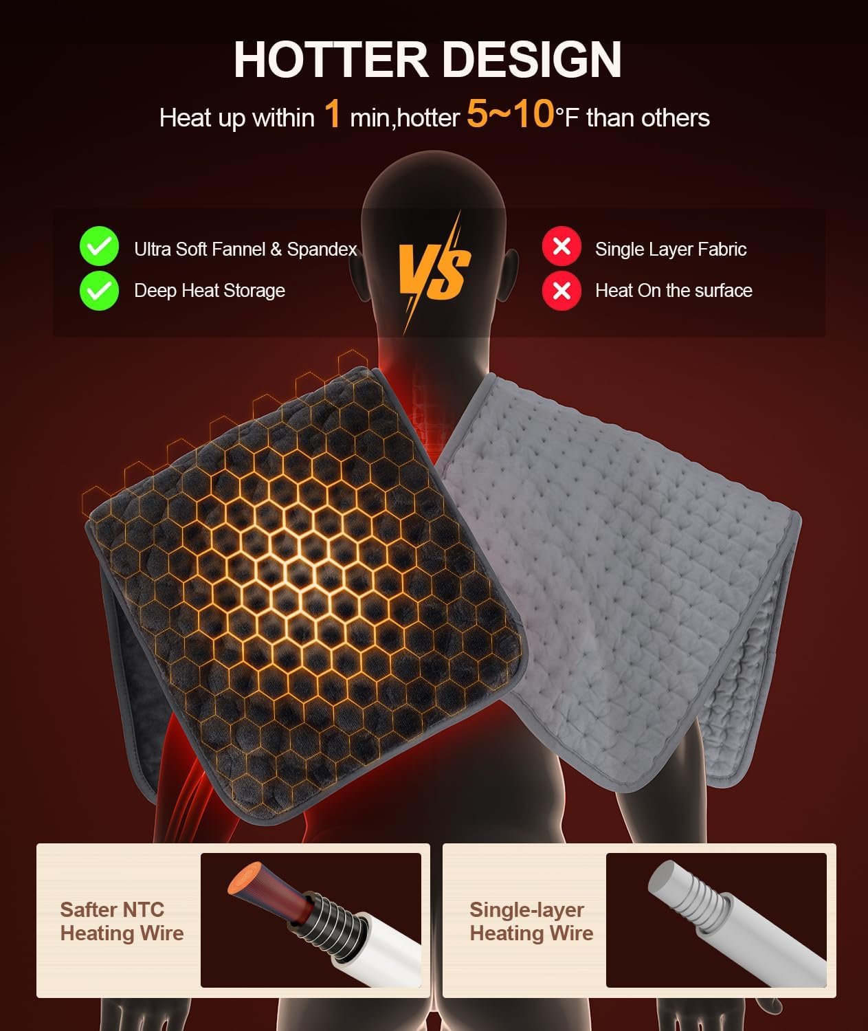 HOTTER THAN OTHER HEATING PADS: Under the same conditions,UTK is at least 5°F to 10°F hotter than other’s since the far infrared heat technology,the combination of flannel and spandex can effectively locks in heat and transfers warmth to the body