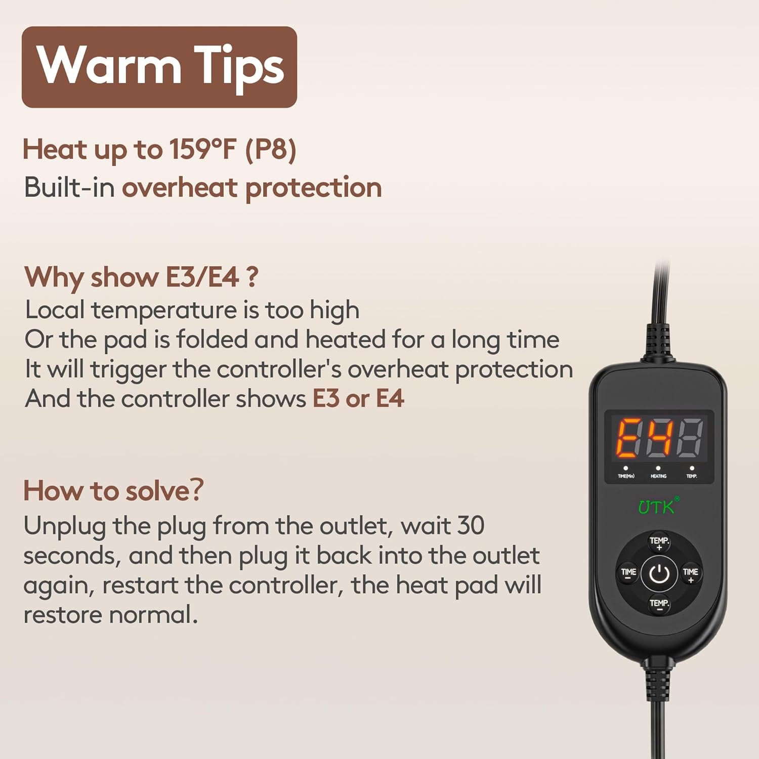 8 HEAT CONTROLLER: 8 heat levels from 95°F to 159°F,240 mins timer,30 mins auto shut off by default. Make sure you have an uninterrupted, immersive, deep sleep