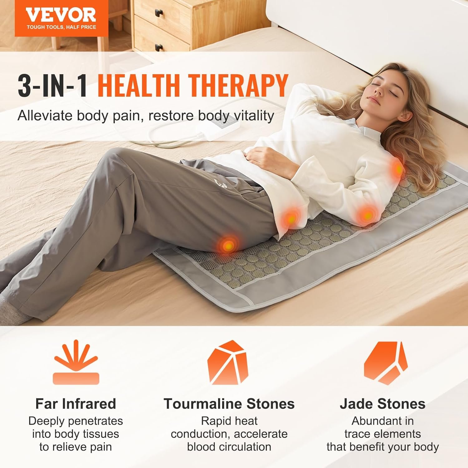 VEVOR far-infrared heating pad is the ideal choice for those seeking soothing heat and health. Combining far-infrared rays, 132 natural jade, and 54 tourmaline stones, it deeply soothes muscle tension, promotes blood circulation, and improves sleep quality. Choose it to embrace a healthier living!