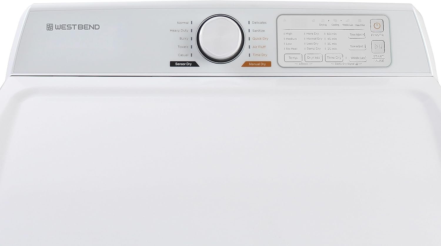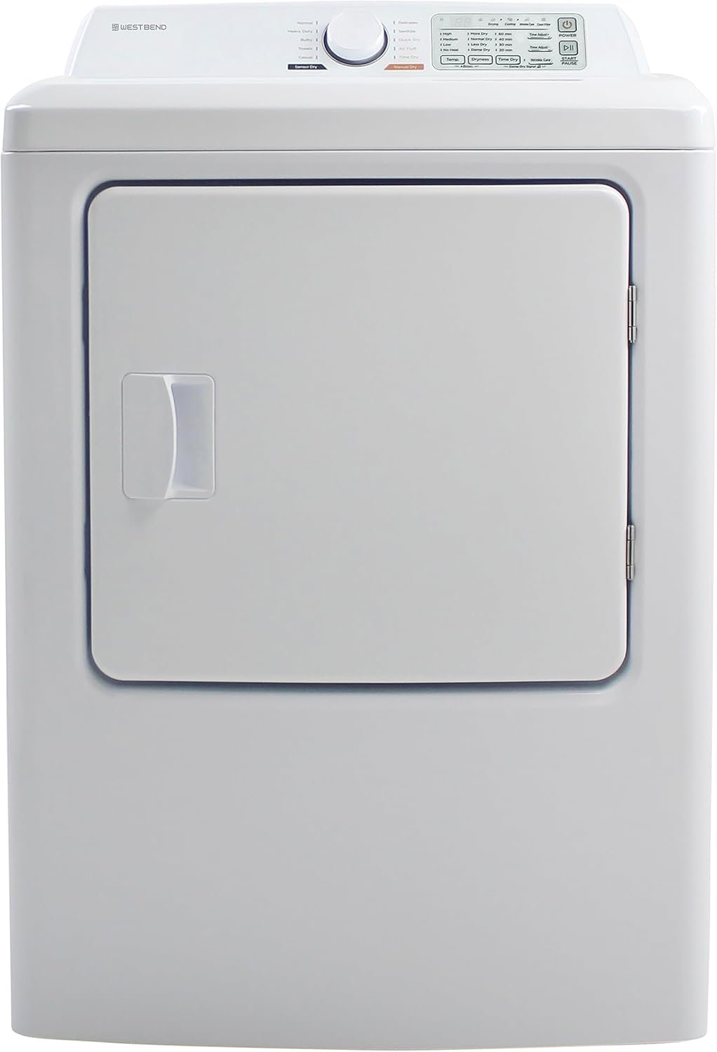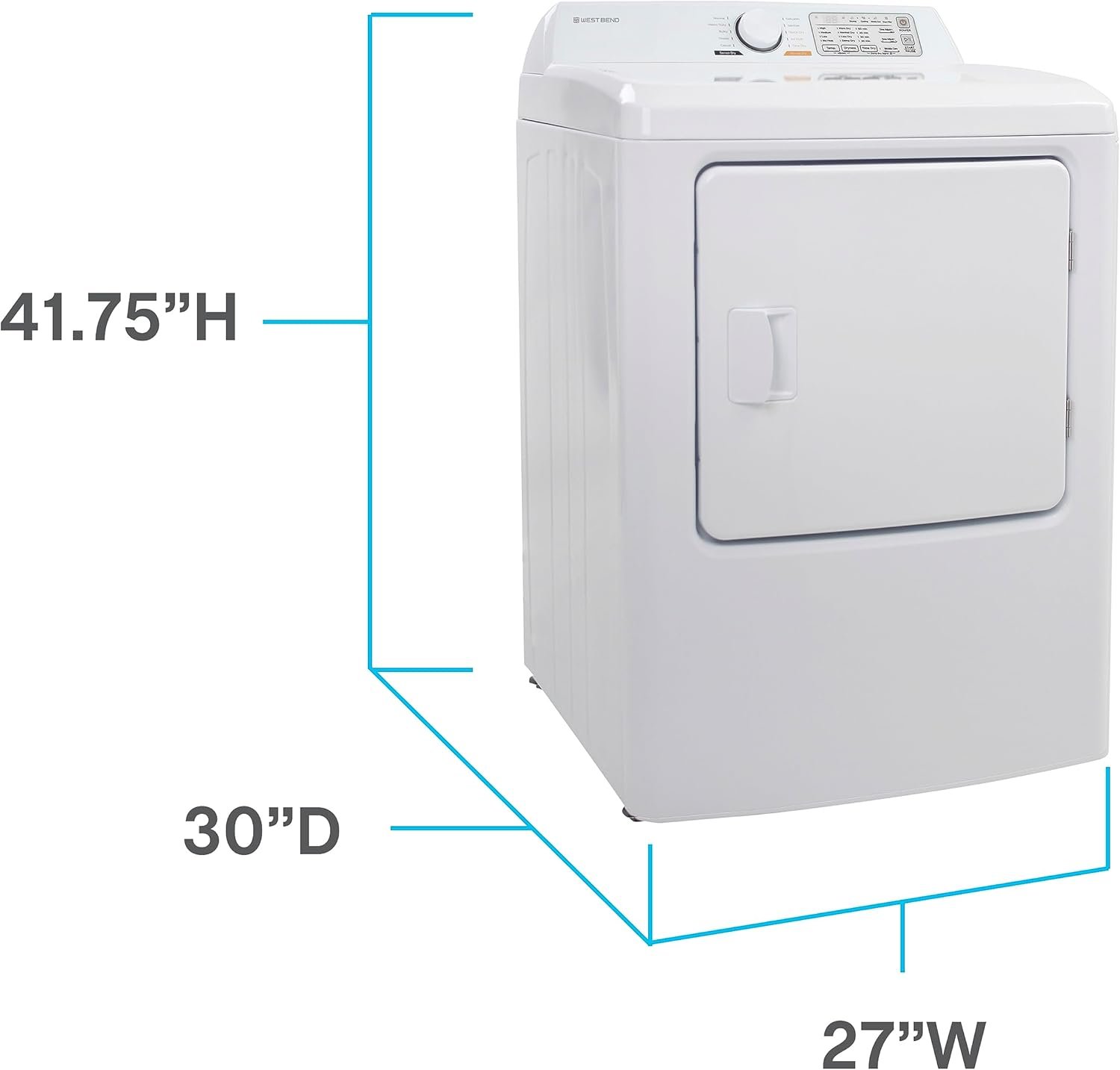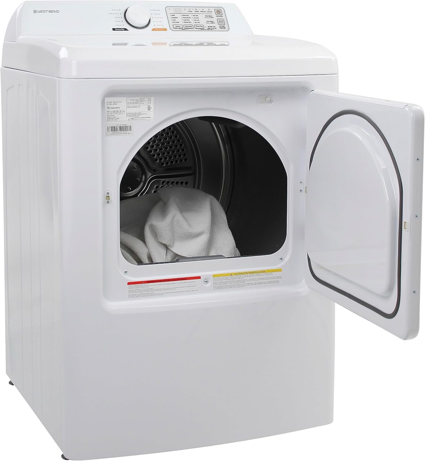 Get more out of every load of laundry with the compact, 6.7 cubic foot, front load, portable electric dryer from West Bend. The perfect-sized clothes dryer, itβs ideal for the dorm, studio apartment, basement, RV, tiny home, rental room, condo, vacation home or anywhere you need a medium-sized dryer. Ten automatic cycles, including normal, heavy duty, towels and more fit all your drying needs. Choose from four temperature settings, dryness settings and and preset drying times to customize each load. Wrinkle care setting helps prevent your clothes from wrinkling. This white front load dryer features a reversible door that lets you easily switch your dryer door to fit any room. Dry laundry at your convenience with this 240V electric clothes dryer designed for flexible installation so it can fit your space needs.