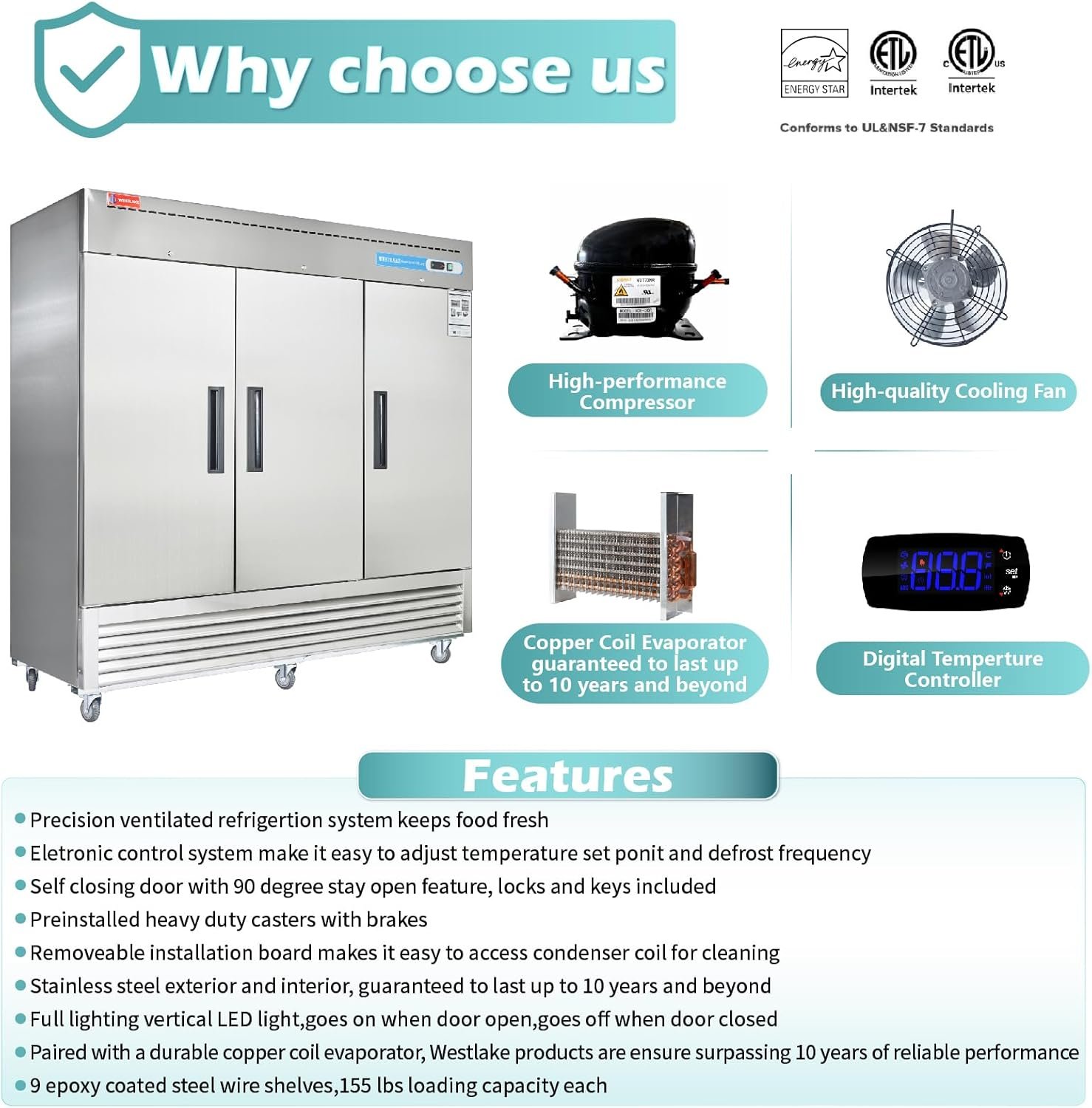 Powerful and reliable: Automatically defrost! Equipped with an high-performance compressor, smart digital controller, and fan cooling system, this commercial refrigerator is designed to provide powerful and reliable refrigeration, so you can be sure that your products will stay fresh and cool.