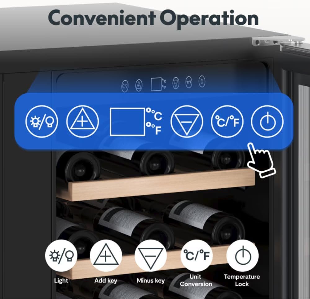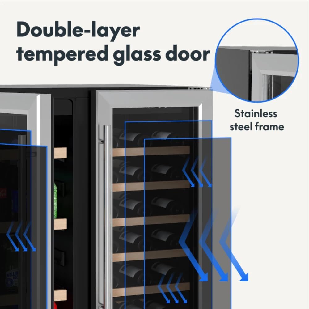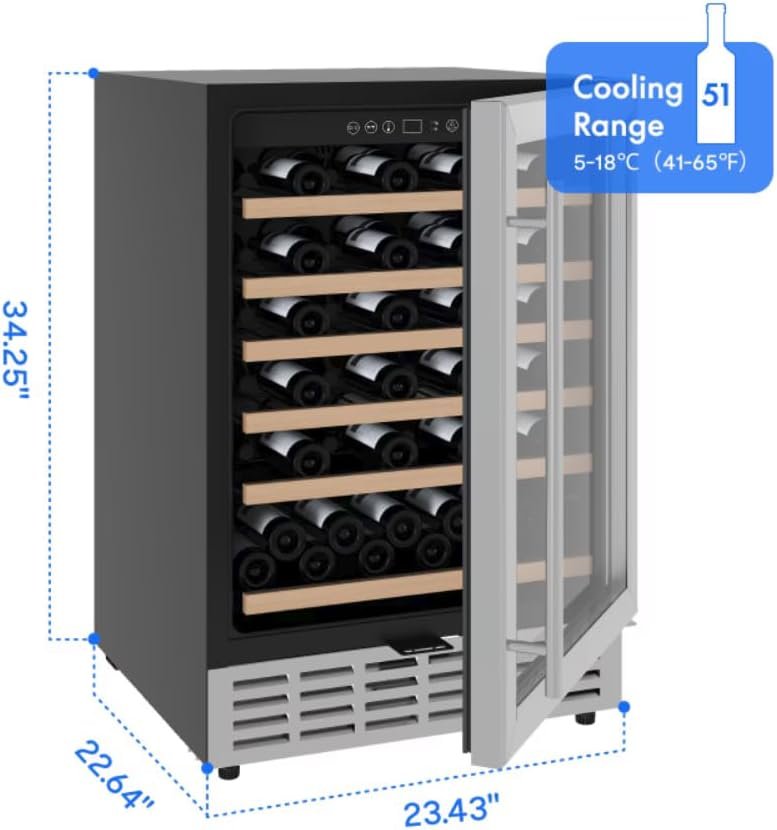 Large Capacity for Wine and Cans:Holds up to 51 bottles of various wine sizes or an assortment of your favorite beverages.Equipped with soft blue LED lighting for easy drink selection at any time.Perfect for both wine enthusiasts and beverage lovers. Stainless Steel & Air Outlet:Features a durable stainless steel frame with double-layer tempered glass, ensuring stable temperature levels and preventing fogging.Automatic defrosting function activates every six hours for hassle-free maintenance. Single Zone with One-Touch Control:LED control display allows easy temperature adjustment between 5-18℃ (41-65℉), maintaining the perfect chill for your beverages.Flexible design allows for built-in or freestanding installation, making it suitable for various spaces. Temperature Memory Function:Automatically restores the previously set temperature after power is restored, protecting your wine and beverages from spoilage.Includes 5 high-quality removable shelves with stoppers on both sides to prevent bottles from falling when shelves are pulled out. Versatile Installation:Compact dimensions of 23.43×22.64×34.25 inches make it ideal for under-counter installation in kitchens or bar areas.Can also be used as a freestanding unit, adapting to your layout needs.