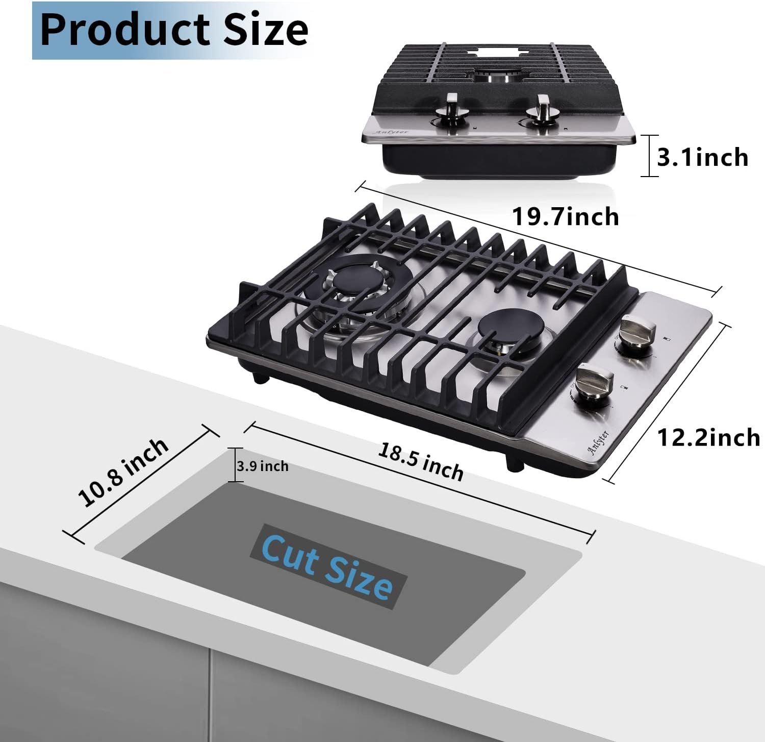 2 Burners Power: 1 x 11262 BTU + 1 x 5972 BTUMain Material: Stainless Steel + Cast IronFuel Type: Propane / Natural GasVoltage: 110VInstallation Type: Built-InControl Type: Knob ControlProduct Size(LxWxH): 12.2 x 19.7 x 3.1 inchCut-out Size(LxWxH): 10.8 x 18.5 x 3.9 inch