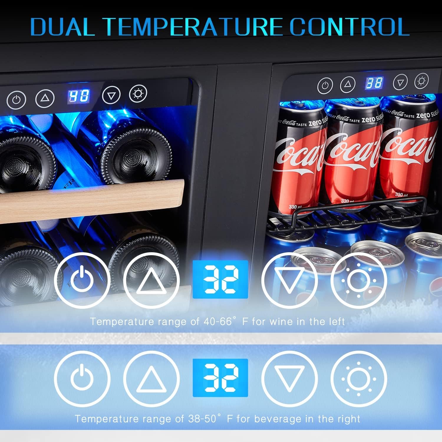 INDENPENDENT TOUCH CONTROL: Bace on digital temperature control, our beverage cooler offers a temperature range of 40-66°F for wine in the left and a range of 38-50°F for beverage in the right.