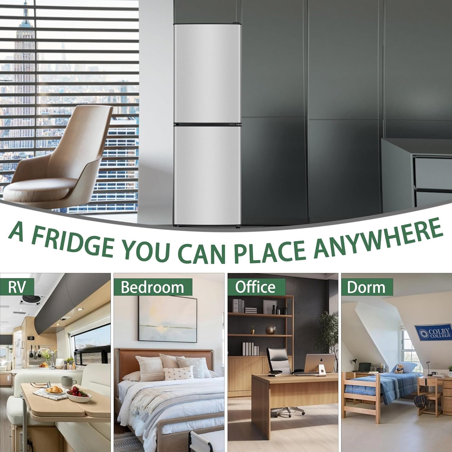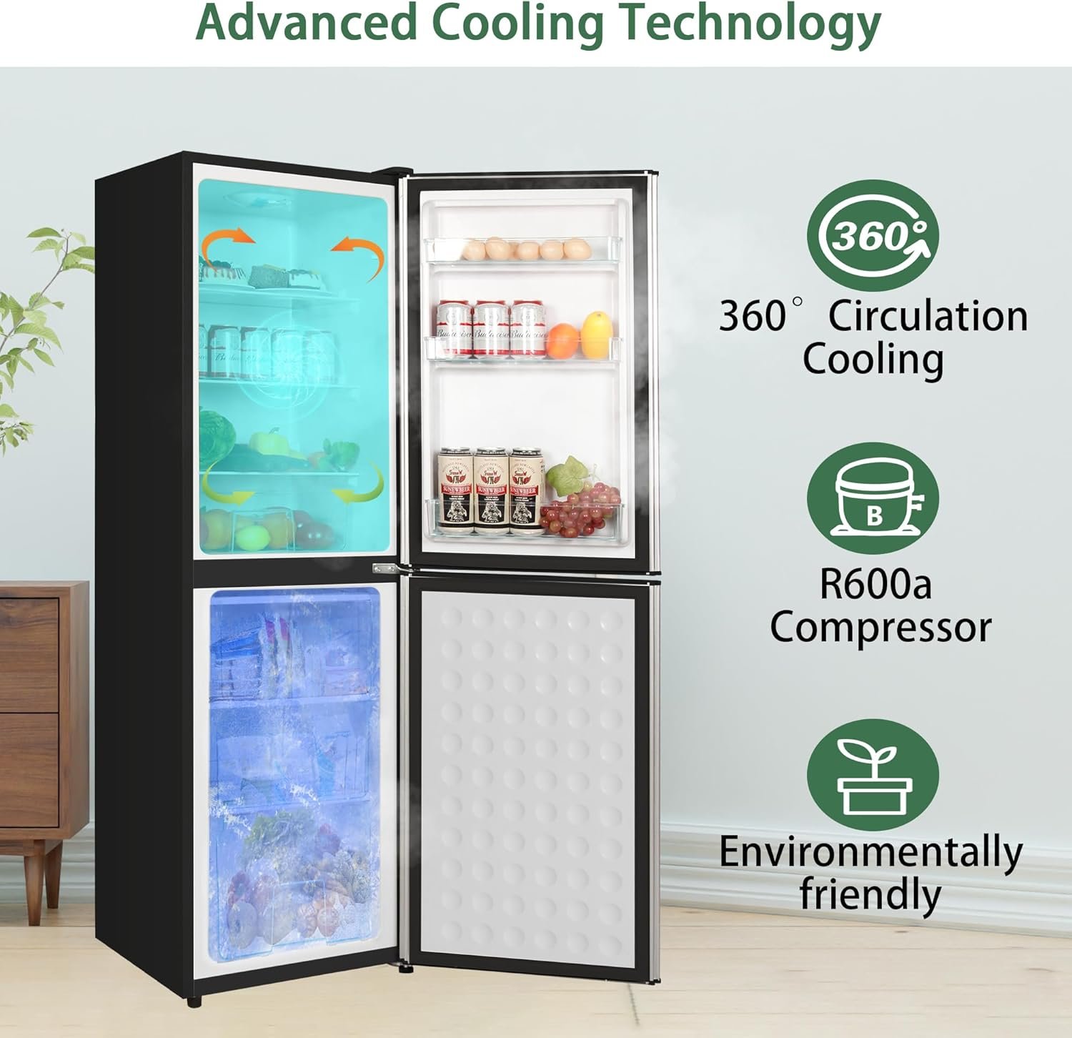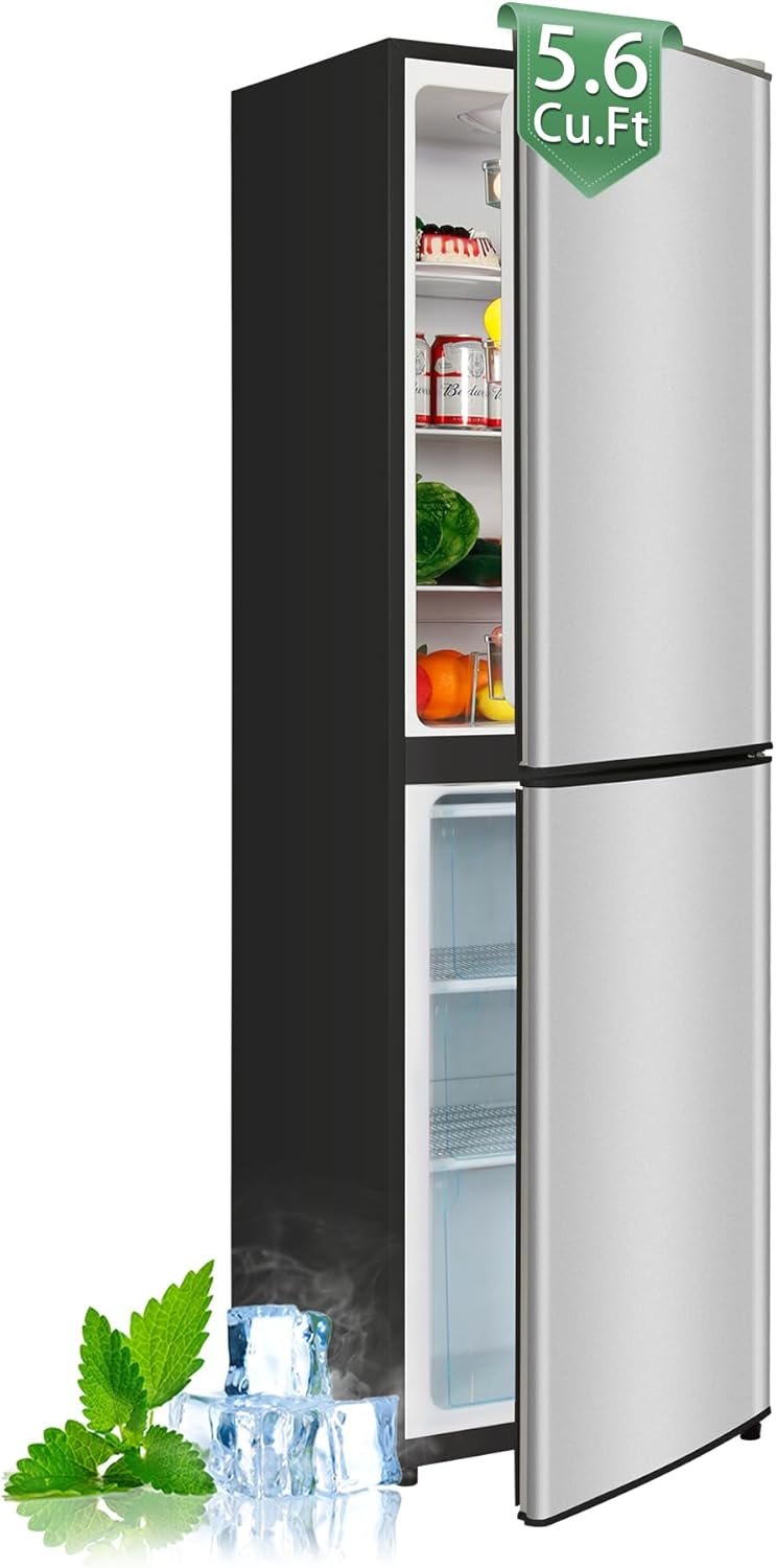 Seamlessly combines freezing and refrigerator functions. With a small footprint and large storage area, the fridge has a total capacity of 5.6 cu. ft. including a larger and deeper freezer section (2.26 cu. ft.) and refrigerator section (3.4 cu. ft.). The refrigerator has a sleek and textured look that suits a variety of living scenarios. It is ideal for apartments,bedroom,office,and kitchen.