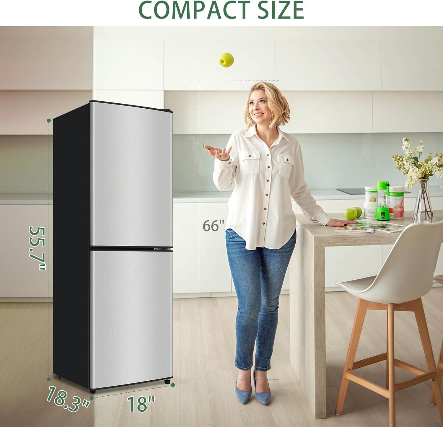 【Extra Large Capacity】 Seamlessly combines freezing and refrigerator functions, this medium fridge is 18″ W x 18.3″ D x 55.7″H, 70 Pounds. Bottom freezer is 2.2 Cu.Ft and top cooler is 3.4 Cu.Ft. Our refrigerator is designed to provide ample room for storing your favorite food and beverages, ideal for apartments,bedroom,office,and kitchen. Moreover, the VCM Steel Surface is stylish and Durable.