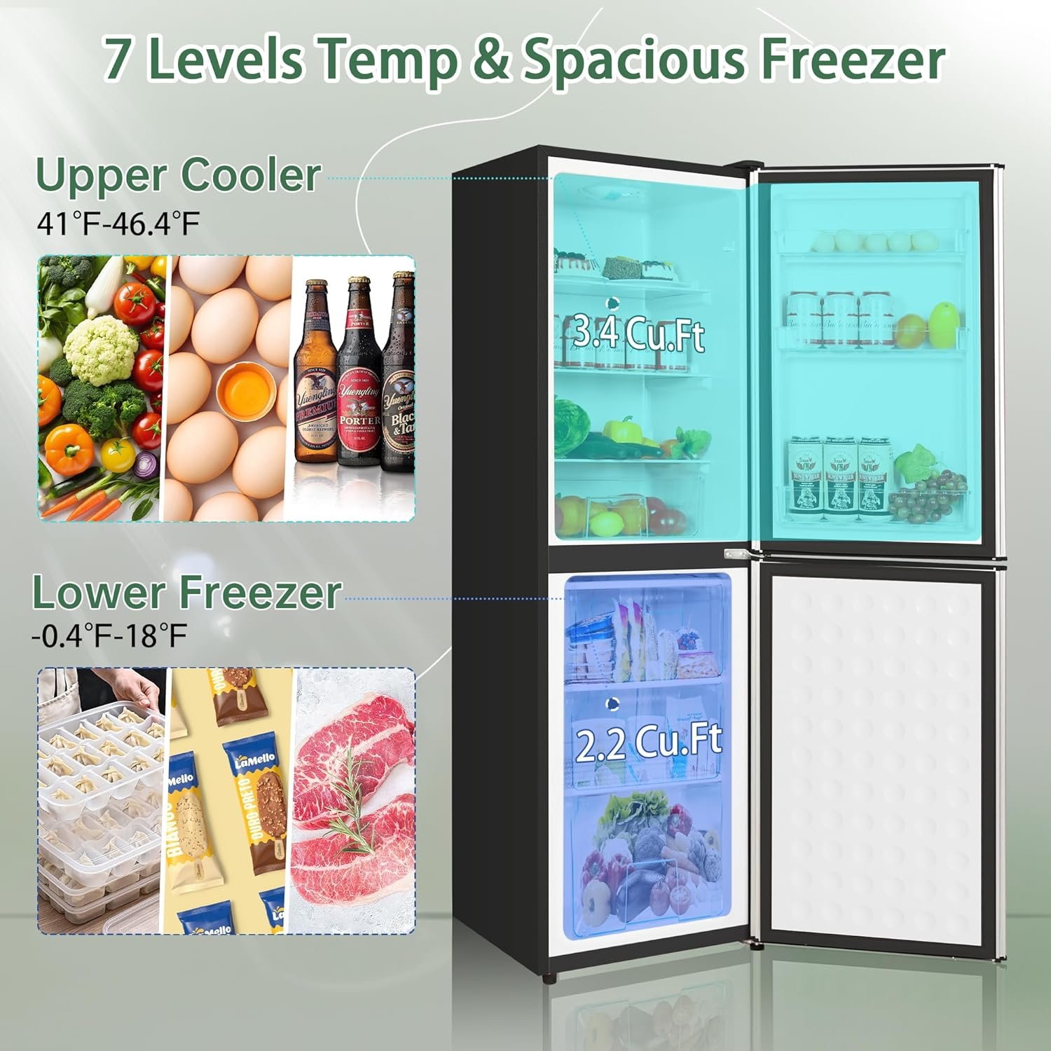 The compact refrigerator has 7 temperature settings with excellent cooling performance. The freezer ranges from -0.4°F to 18°F and the refrigerator is from 41°F to 46.4°F. The temperature settings range from 1 (warmest) to 7 (coldest), with 4-5 being the optimal temperature. You can store various foods including meat, eggs, milk, beer,coffee,vegetables, fruit, and ice cream.