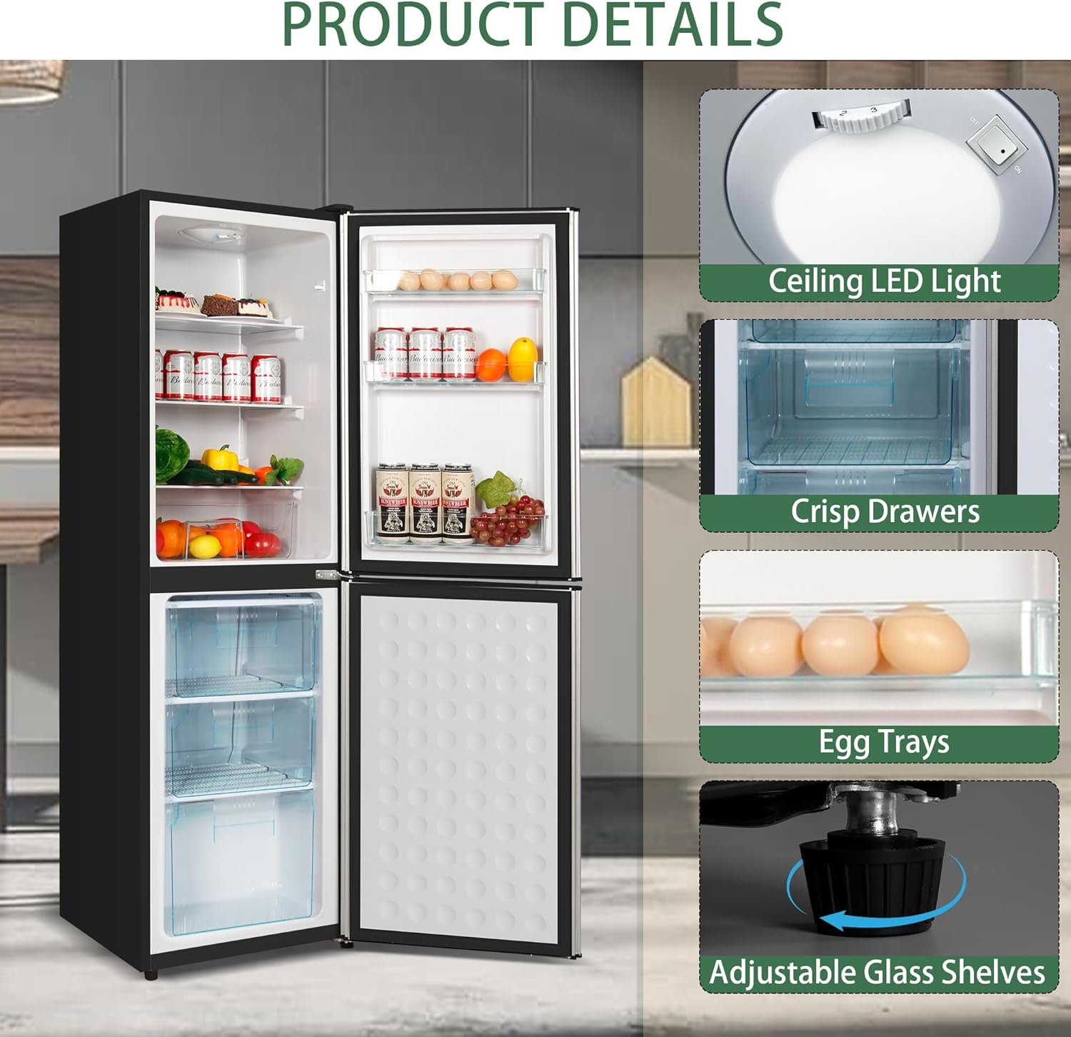 【Efficient Internal Compartments】 The 2.2 cu.ft freezer section has 3 crisper drawers, which provides plenty of storage for meats, ice cream, more tidy and hygienic. As for refrigerated part, it includes 3 adjustable glass shelves, 2 egg trays and the side door racks offer beverage storage. By the way, kitchen refrigerator has an automatic LED light inside, which can easily illuminate when you open the refrigerator at night.