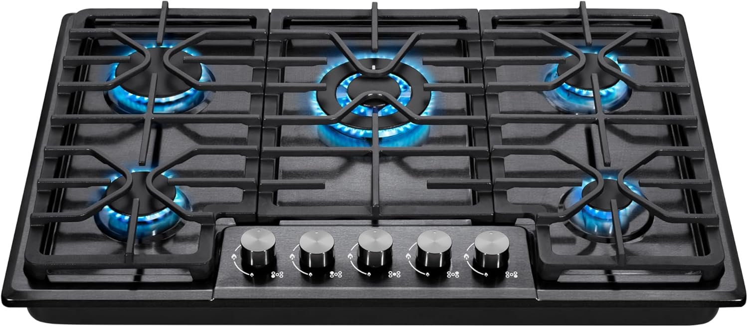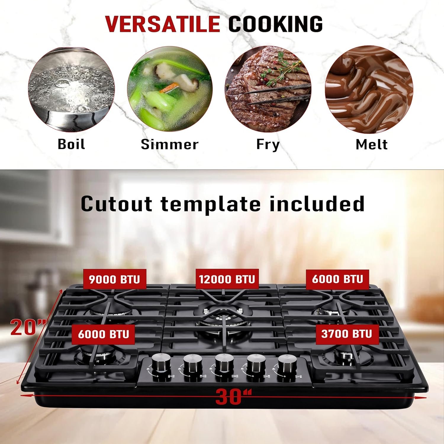 This gas cooktop 30 inch featured with 5 powerful sealed burners. One 11,000 BTU burner is for boiling water or cooking larger dishes. One 9,500 BTU burner is great for medium-heat tasks like Pan frying and stir-frying. Two 6,000 BTU burners are perfect for simmering and keeping your food warm. One 3,400 BTU auxiliary simmer burner allows you to cook sauce and other items.