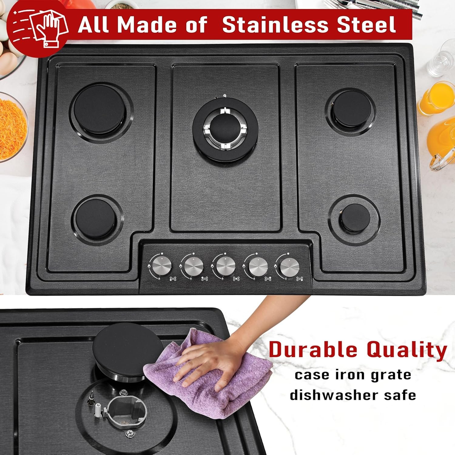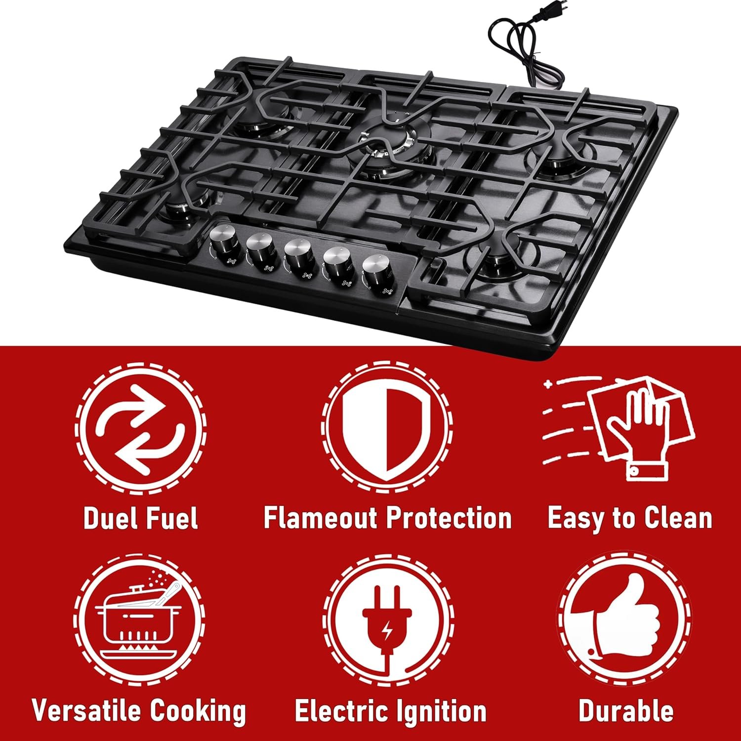 5 reviews for 5 Burner Gas Cooktop Black, 30 Inch LPG/NG Dual Fuel Drop in Gas Stove Top, Stainless Steel Electronic Ignition for Apartment, Outdoor, RV