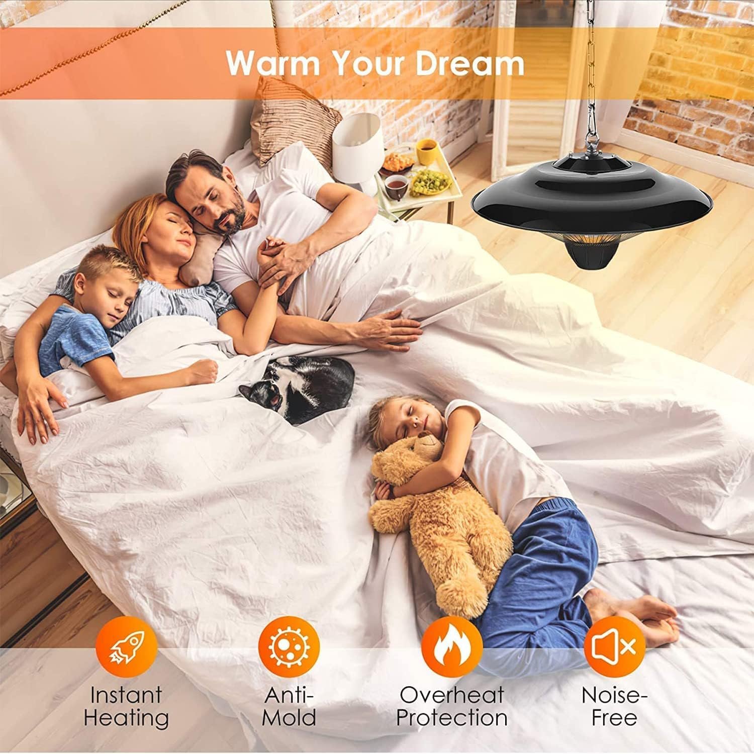 Easy to Assemble & Use: This electric patio heater comes with an 8.2″ adjustable chain for hassle-free hanging. Simply pull the cord to turn on, making it easy to use without the need for a remote control